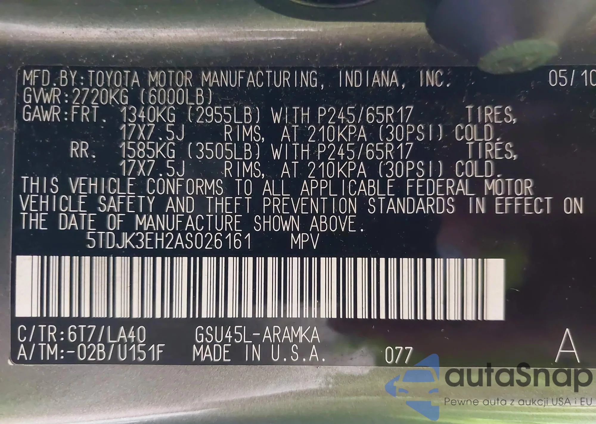 LOT: 42850664 VIN: 5TDJK3EH2AS026161