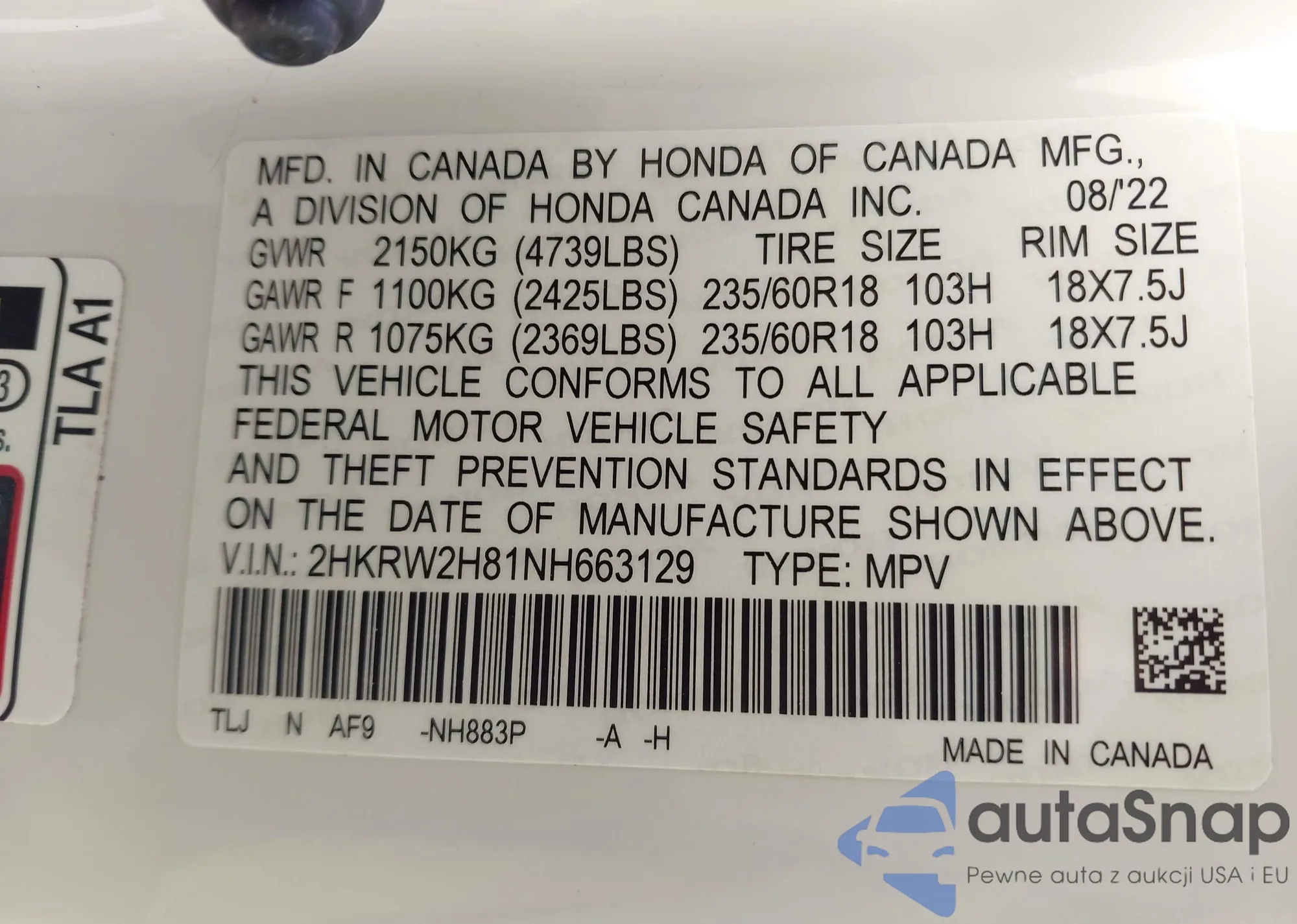• VIN 2HKRW2H81NH663129