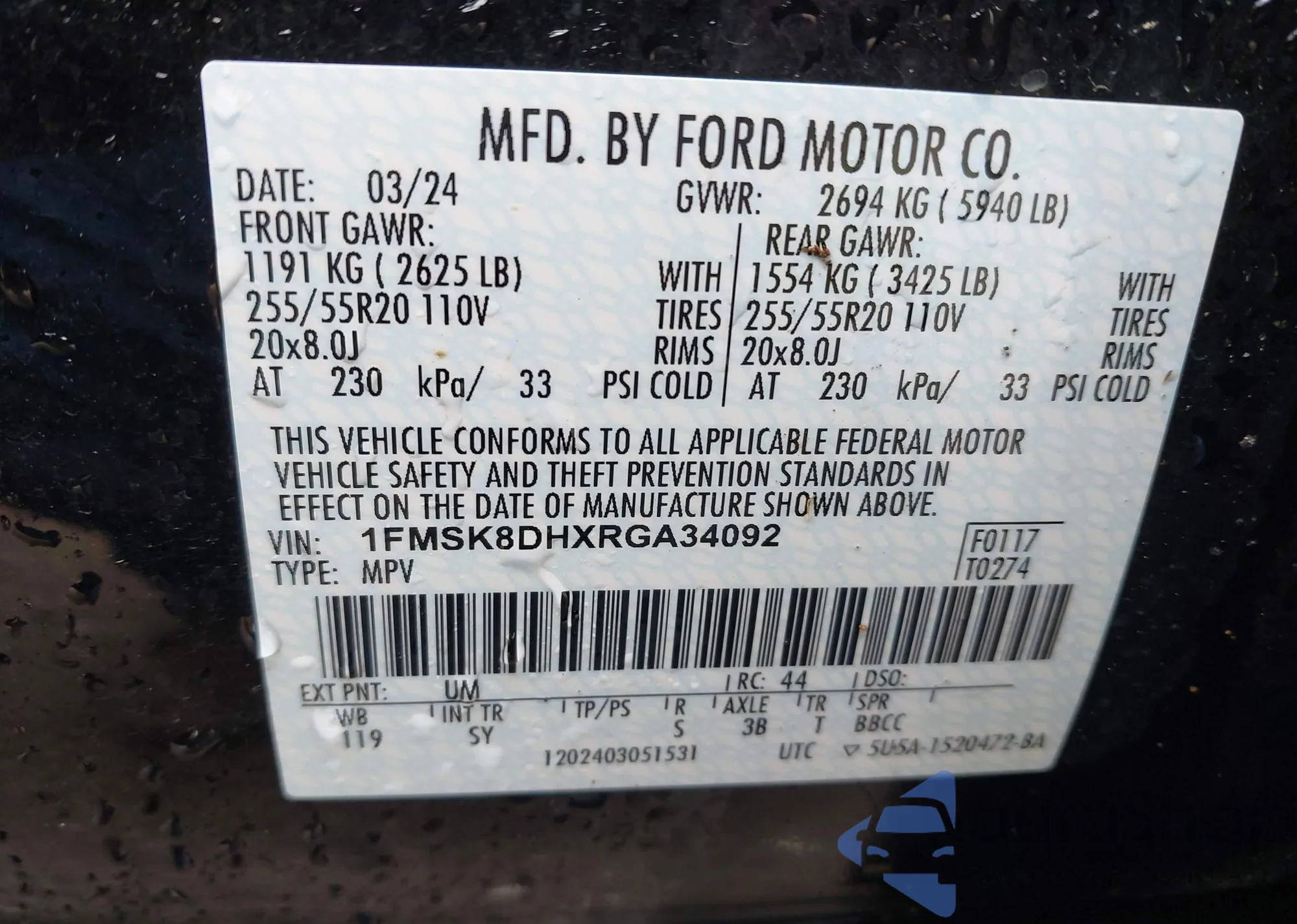 • VIN 1FMSK8DHXRGA34092