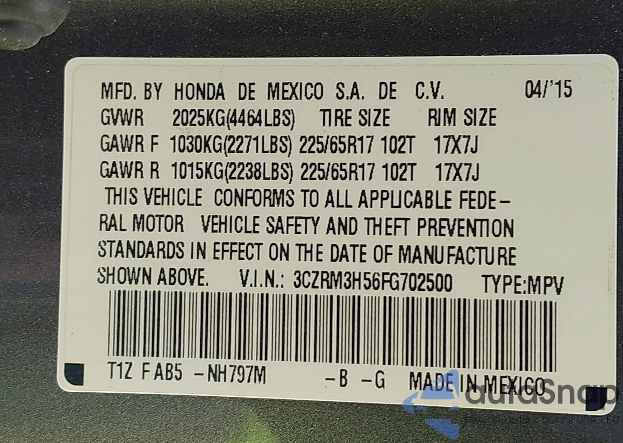 • VIN 3CZRM3H56FG702500
