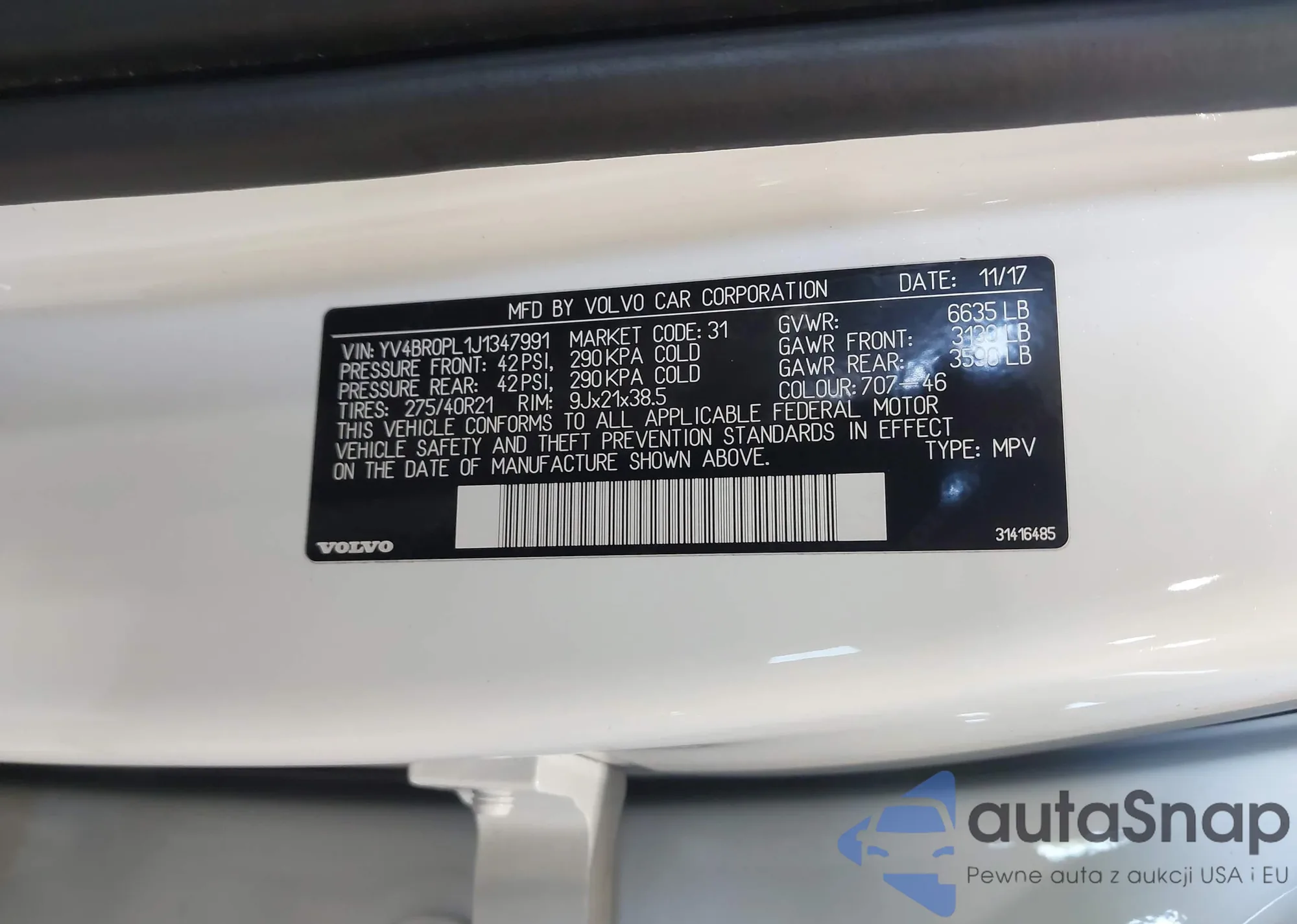 LOT: 42805494 VIN: YV4BR0PL1J1347991
