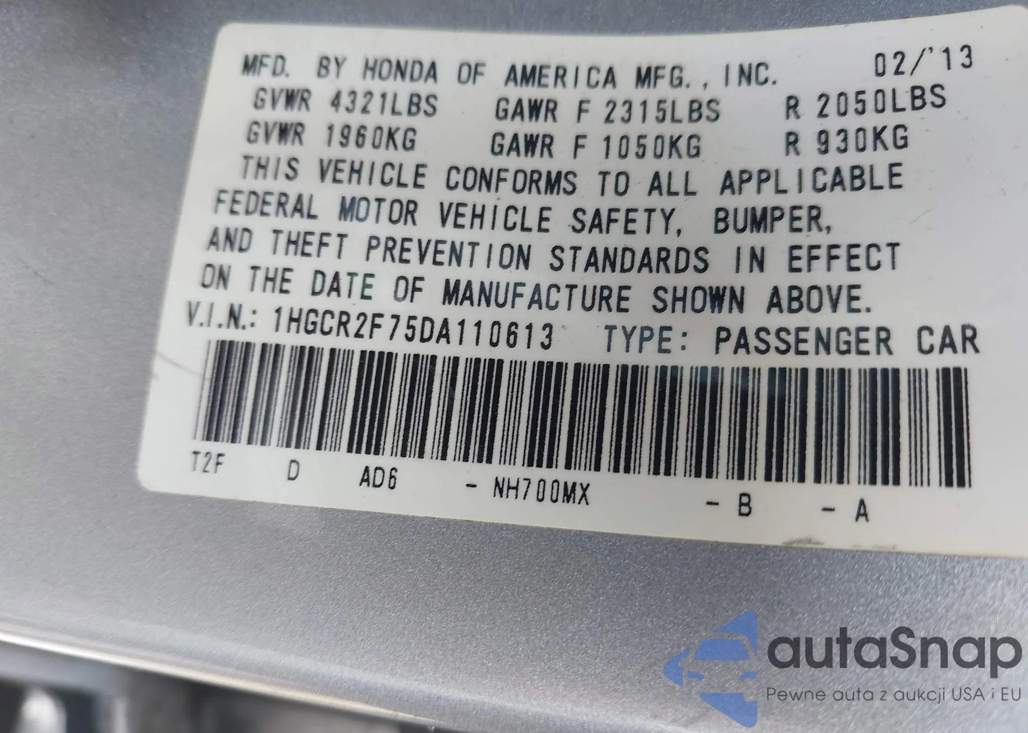 • VIN 1HGCR2F75DA110613