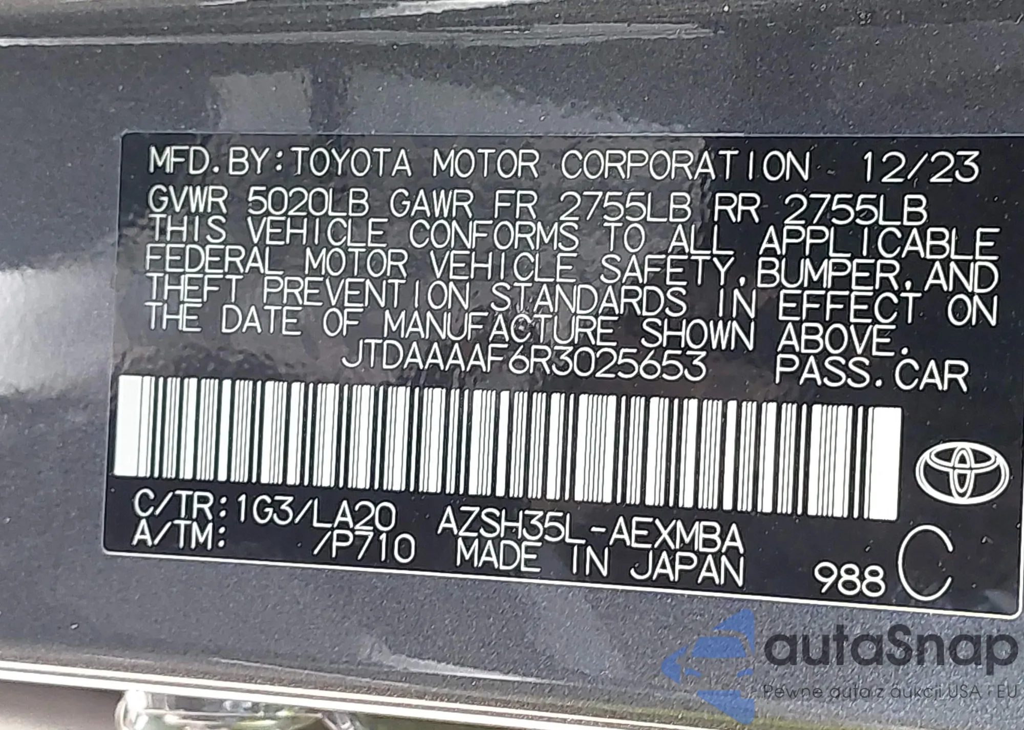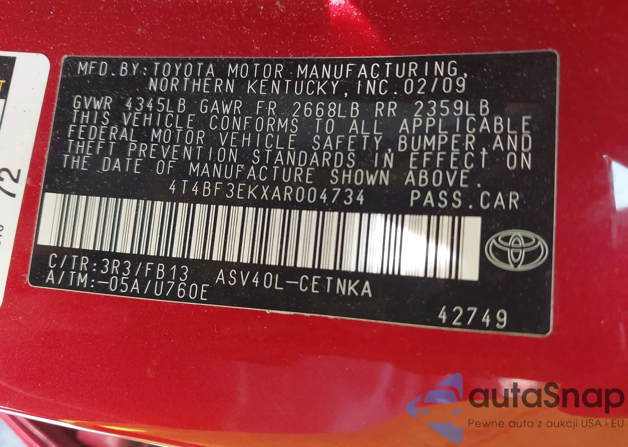• VIN 4T4BF3EKXAR004734