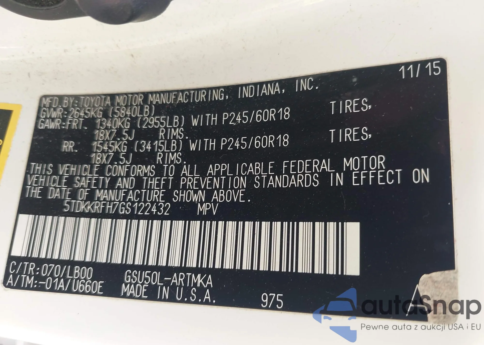 LOT: 42693385 VIN: 5TDKKRFH7GS122432