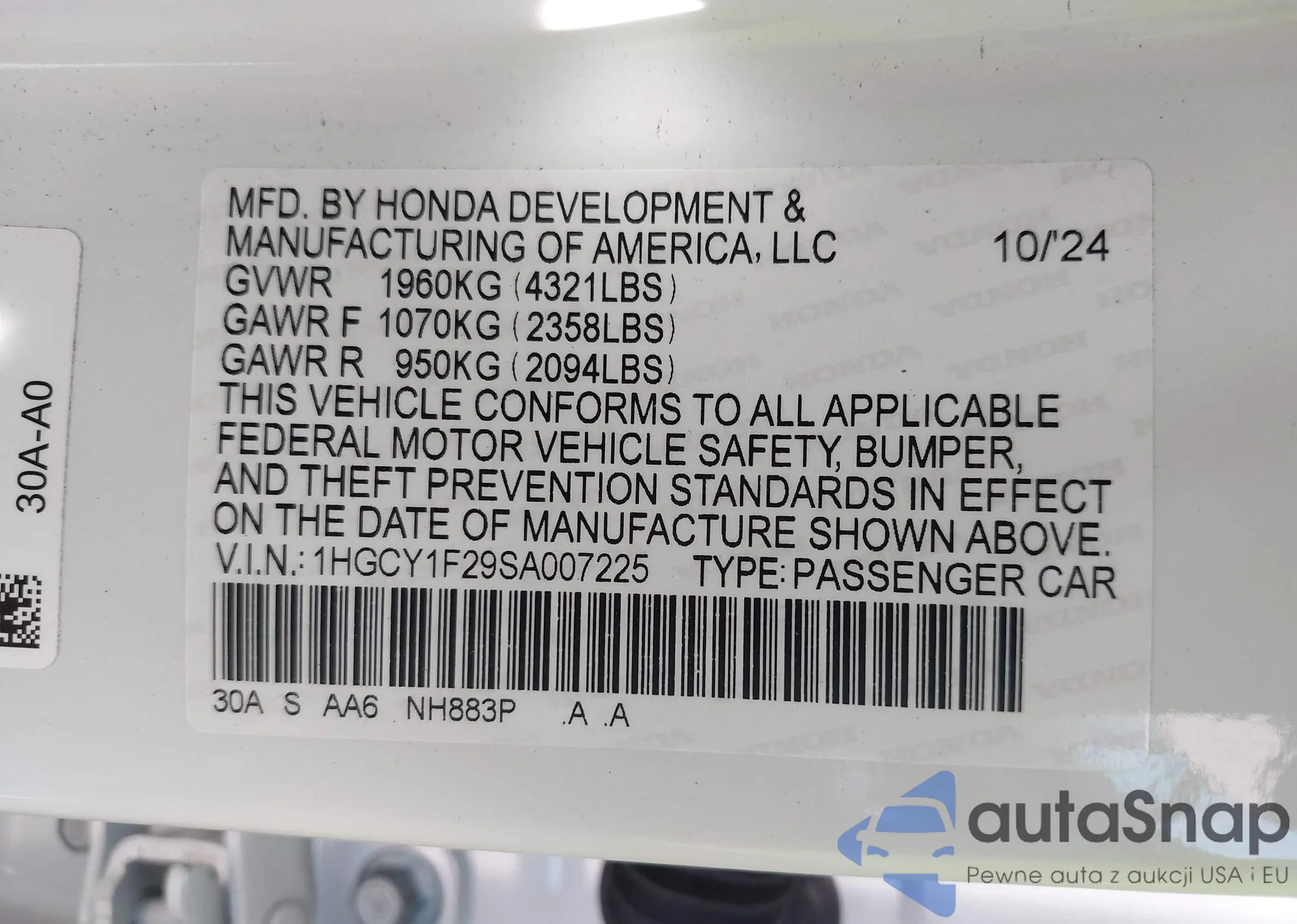 • VIN 1HGCY1F29SA007225