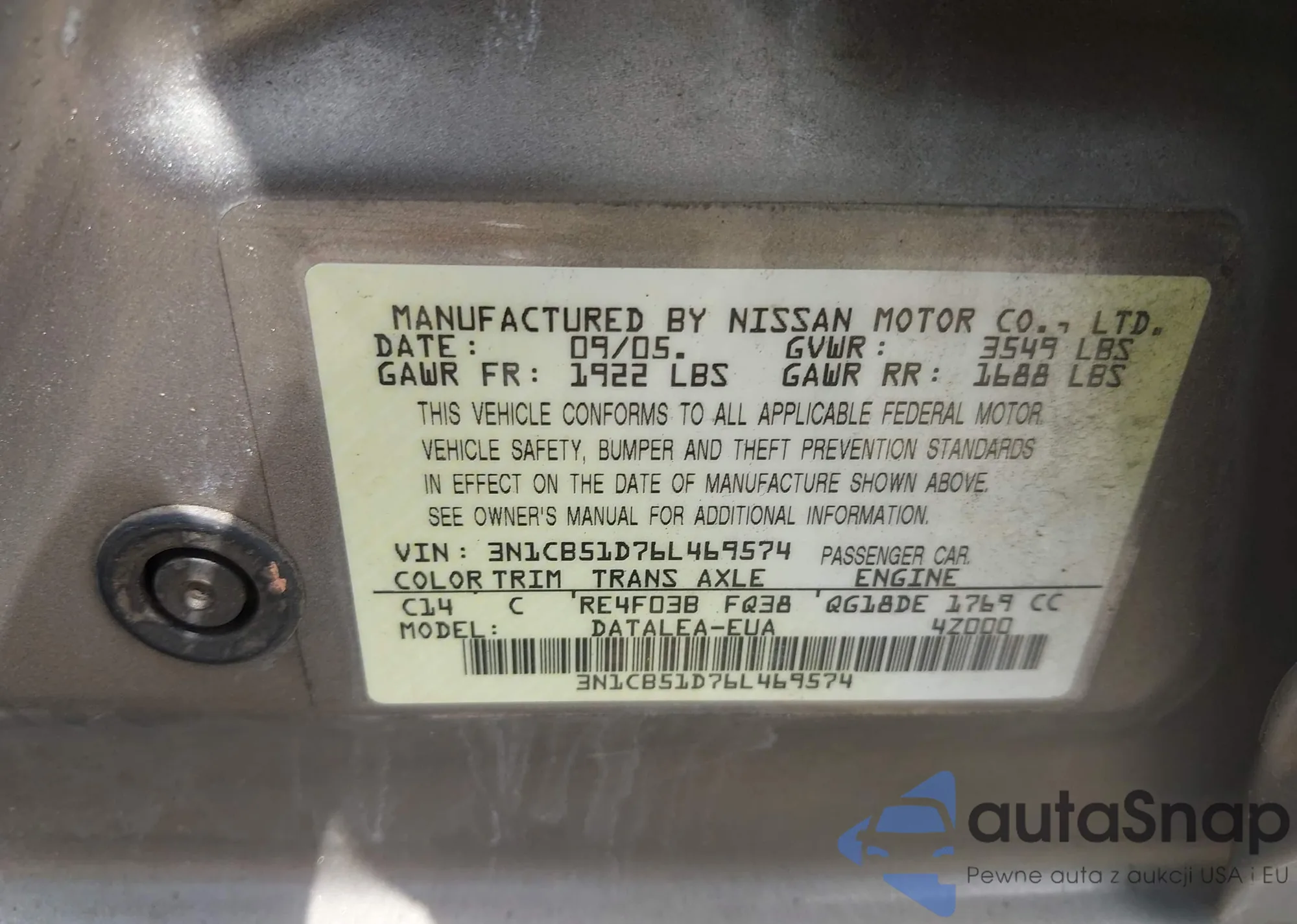 • VIN 3N1CB51D76L469574