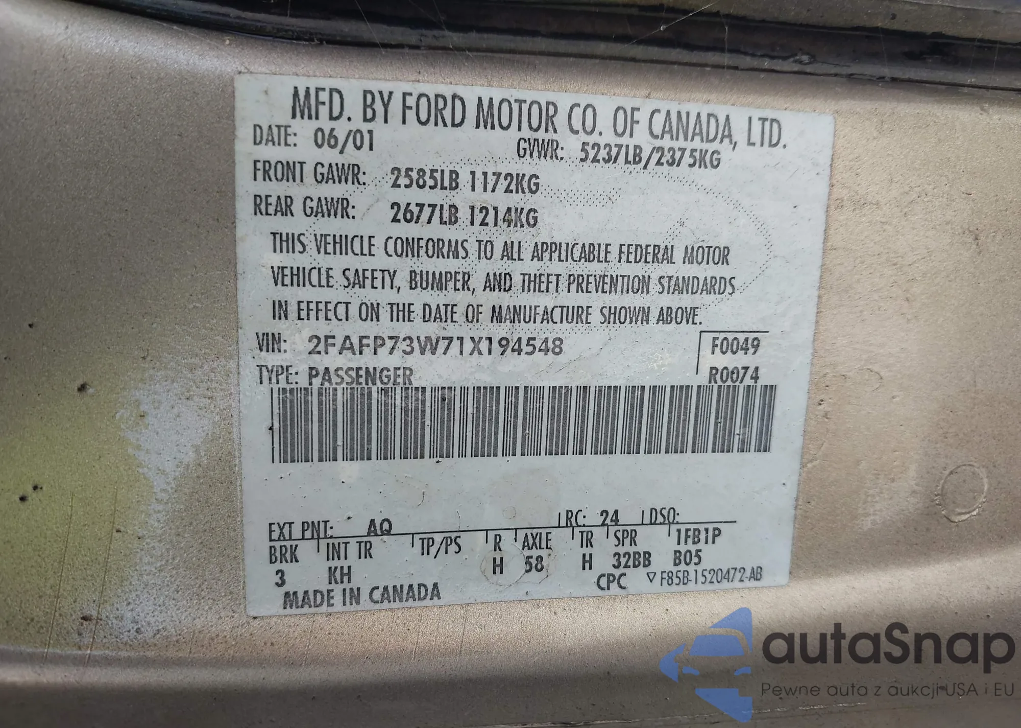 LOT: 42711398 VIN: 2FAFP73W71X194548