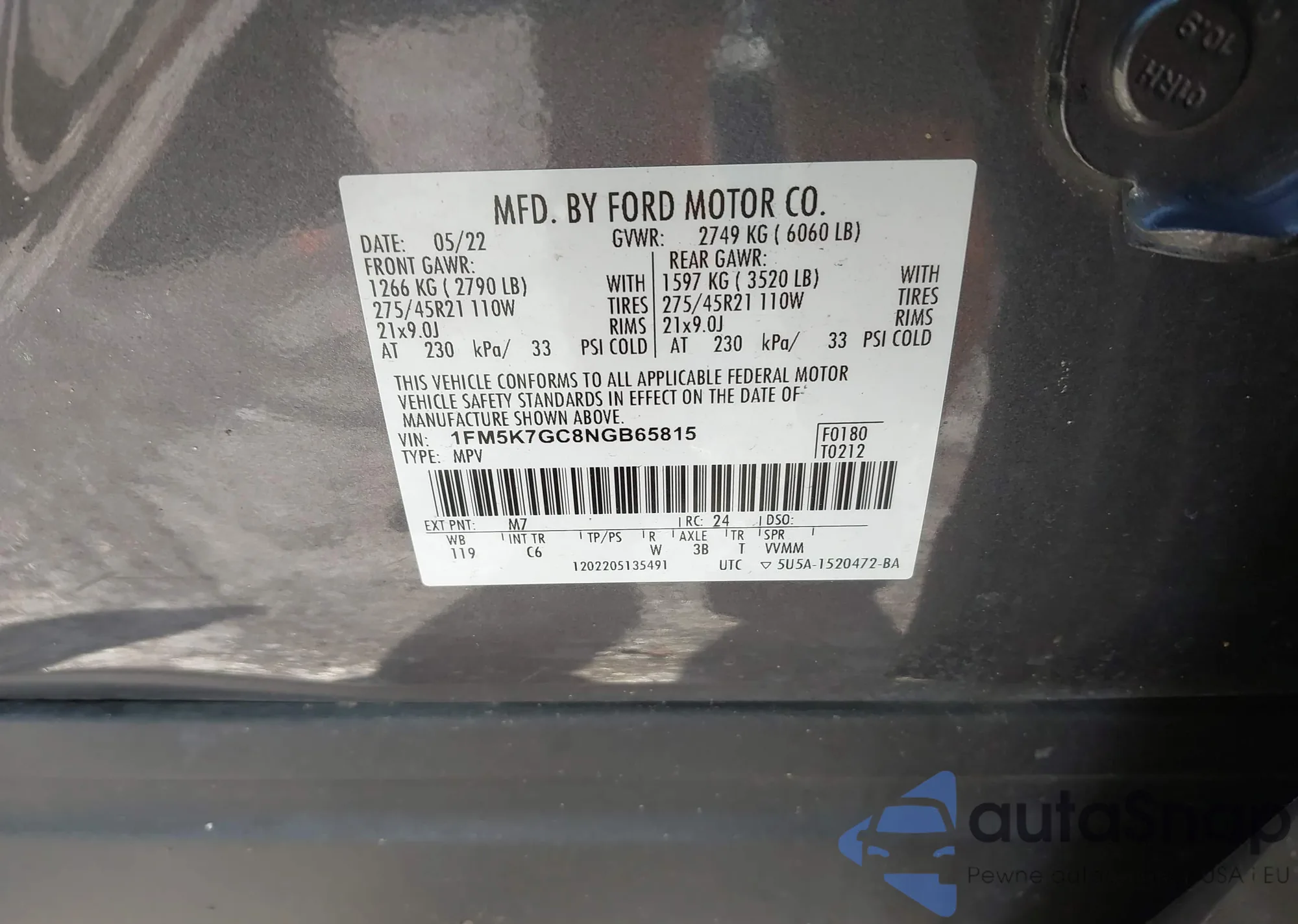 LOT: 42742227 VIN: 1FM5K7GC8NGB65815