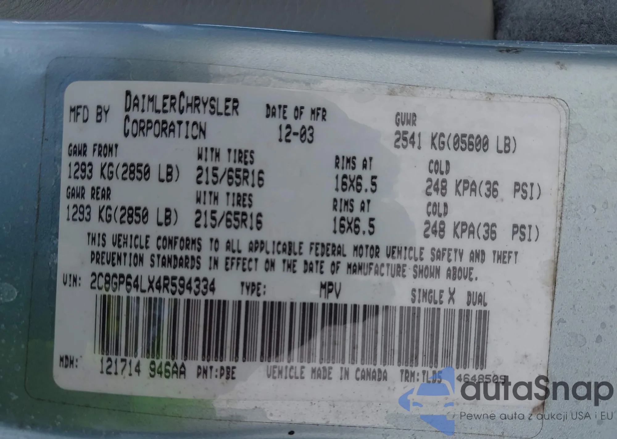• VIN 2C8GP64LX4R594334