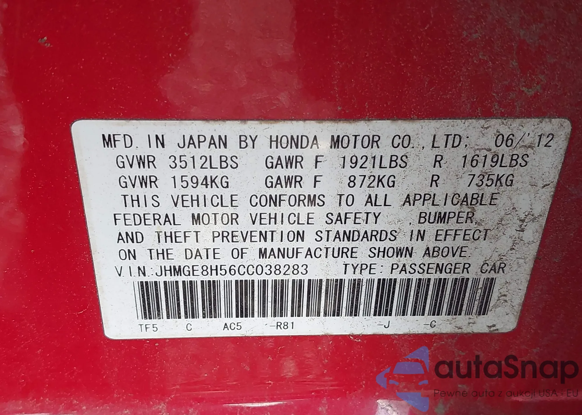 • VIN JHMGE8H56CC038283