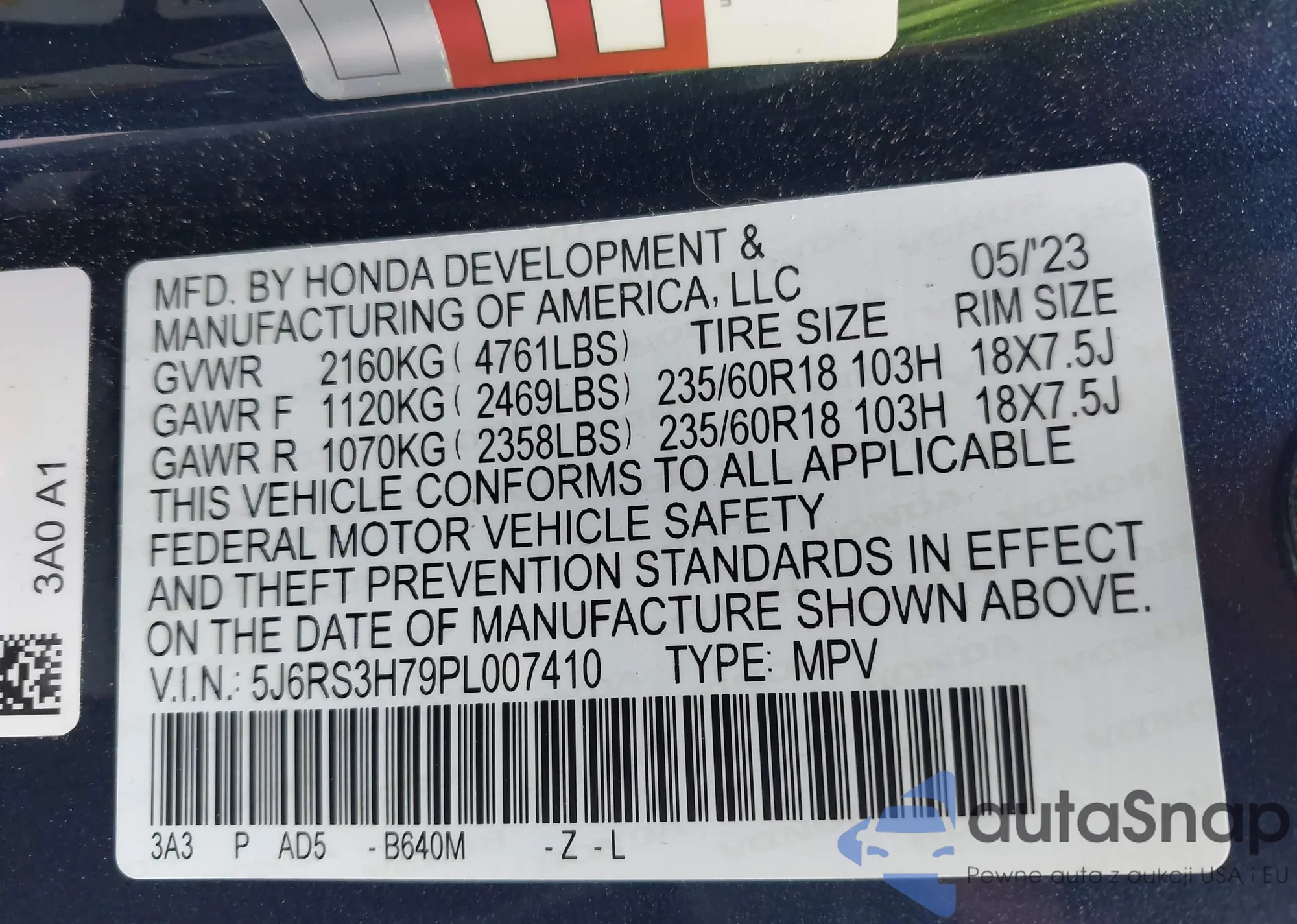 • VIN 5J6RS3H79PL007410