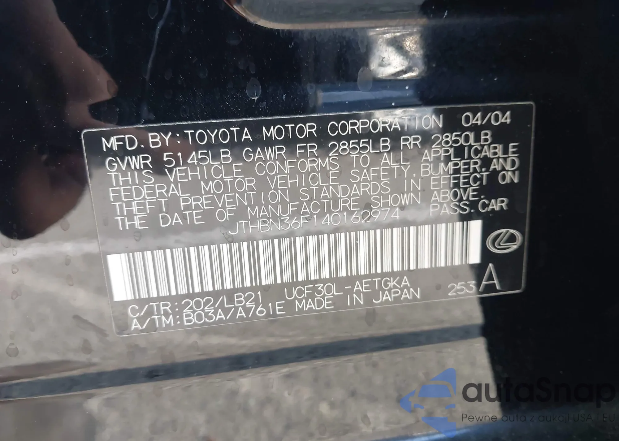 • VIN JTHBN36F140162974