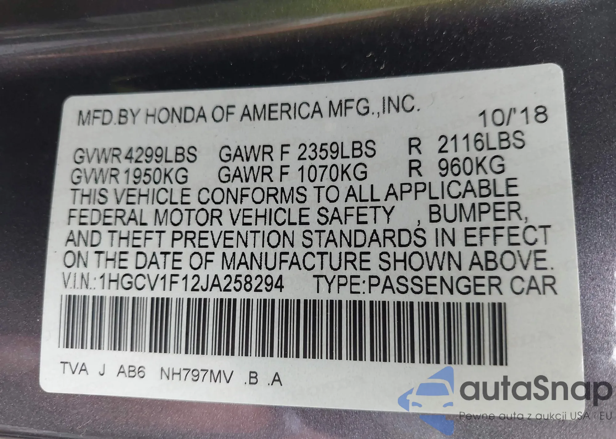 LOT: 42901919 VIN: 1HGCV1F12JA258294