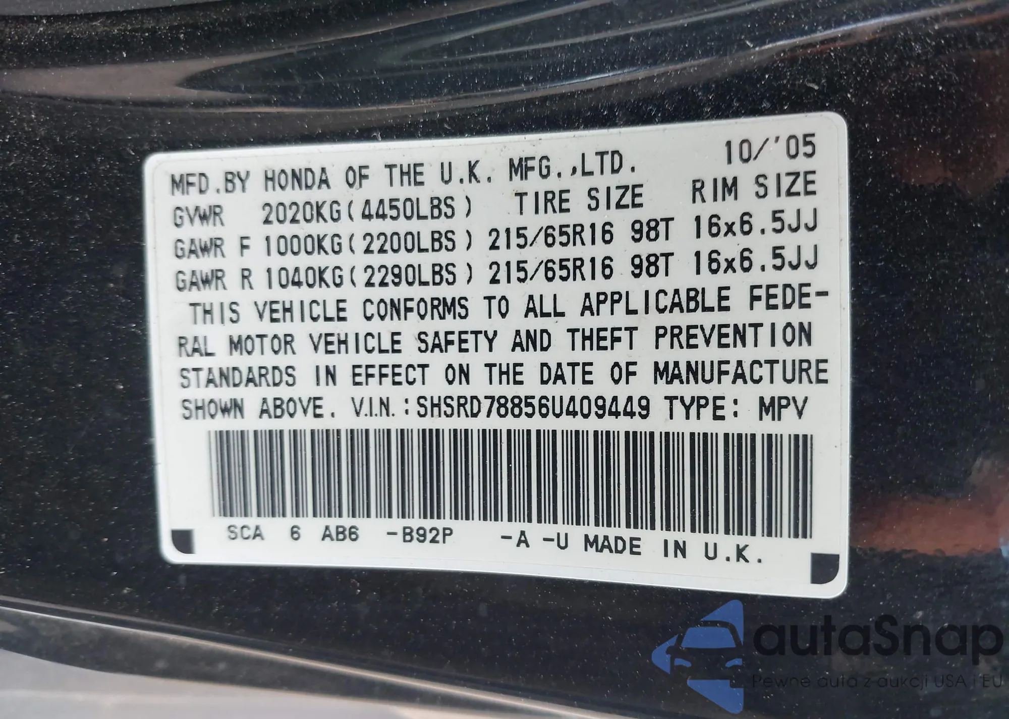 • VIN SHSRD78856U409449
