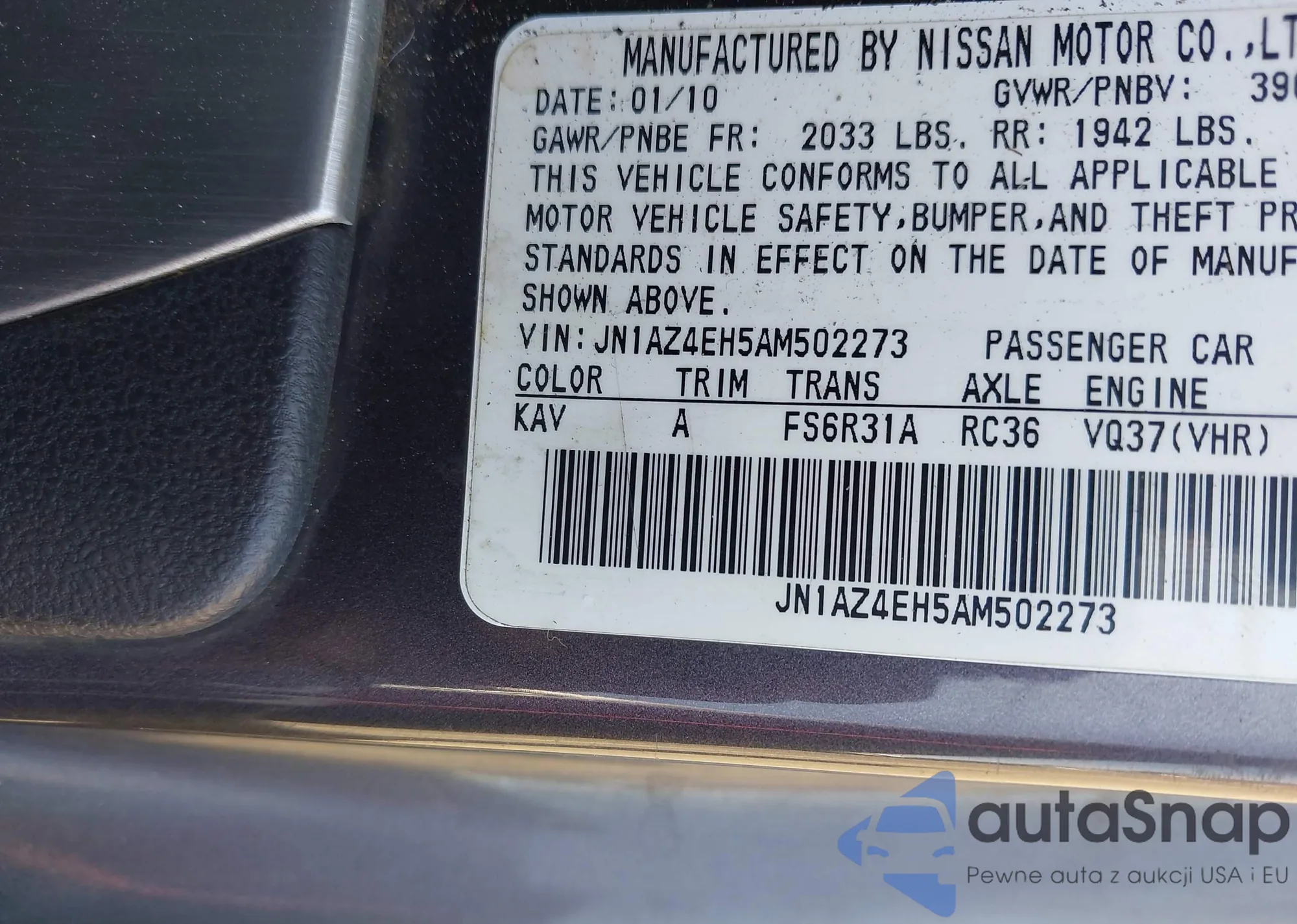 LOT: 42659235 VIN: JN1AZ4EH5AM502273