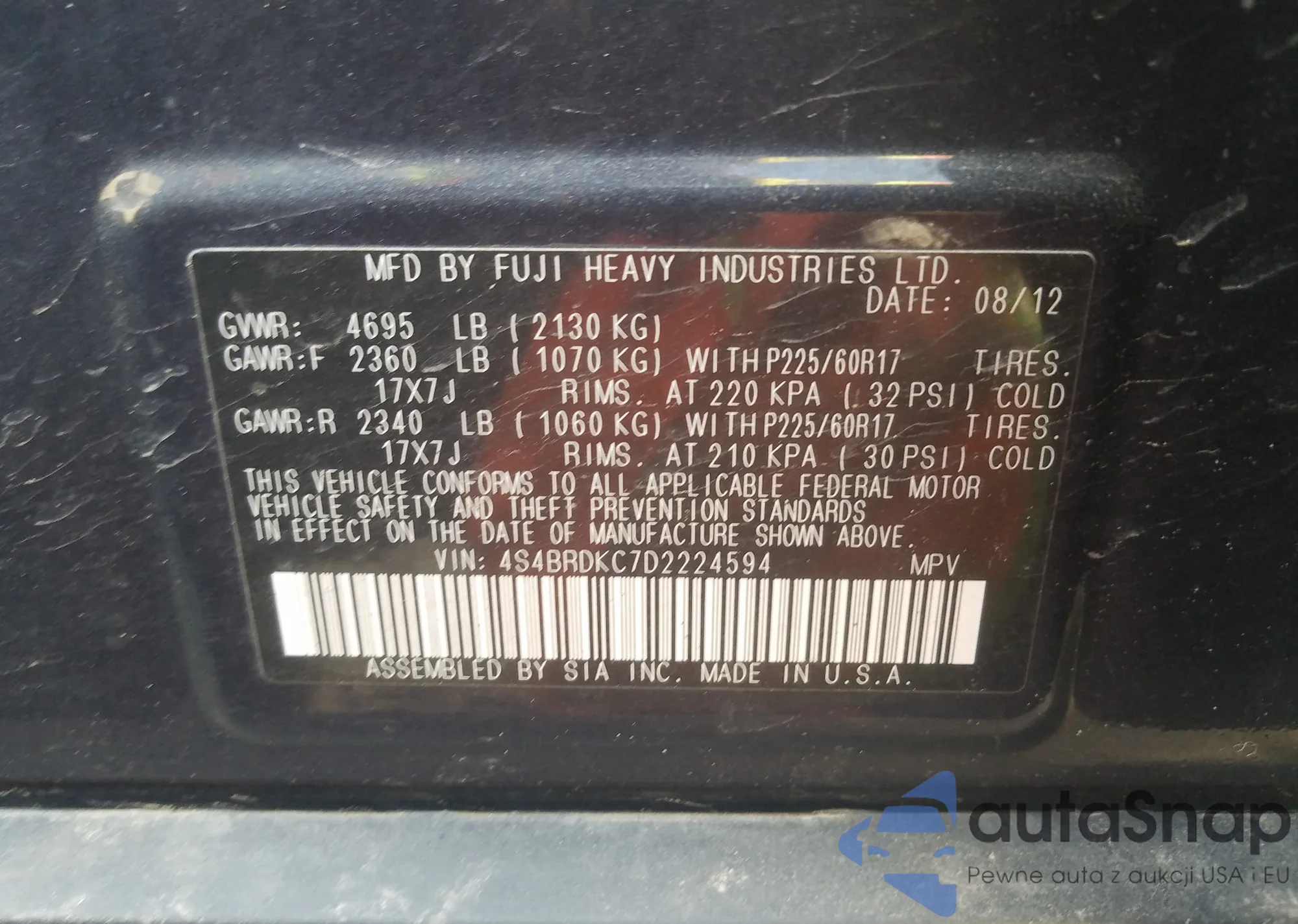 LOT: 47638000 VIN: 4S4BRDKC7D2224594
