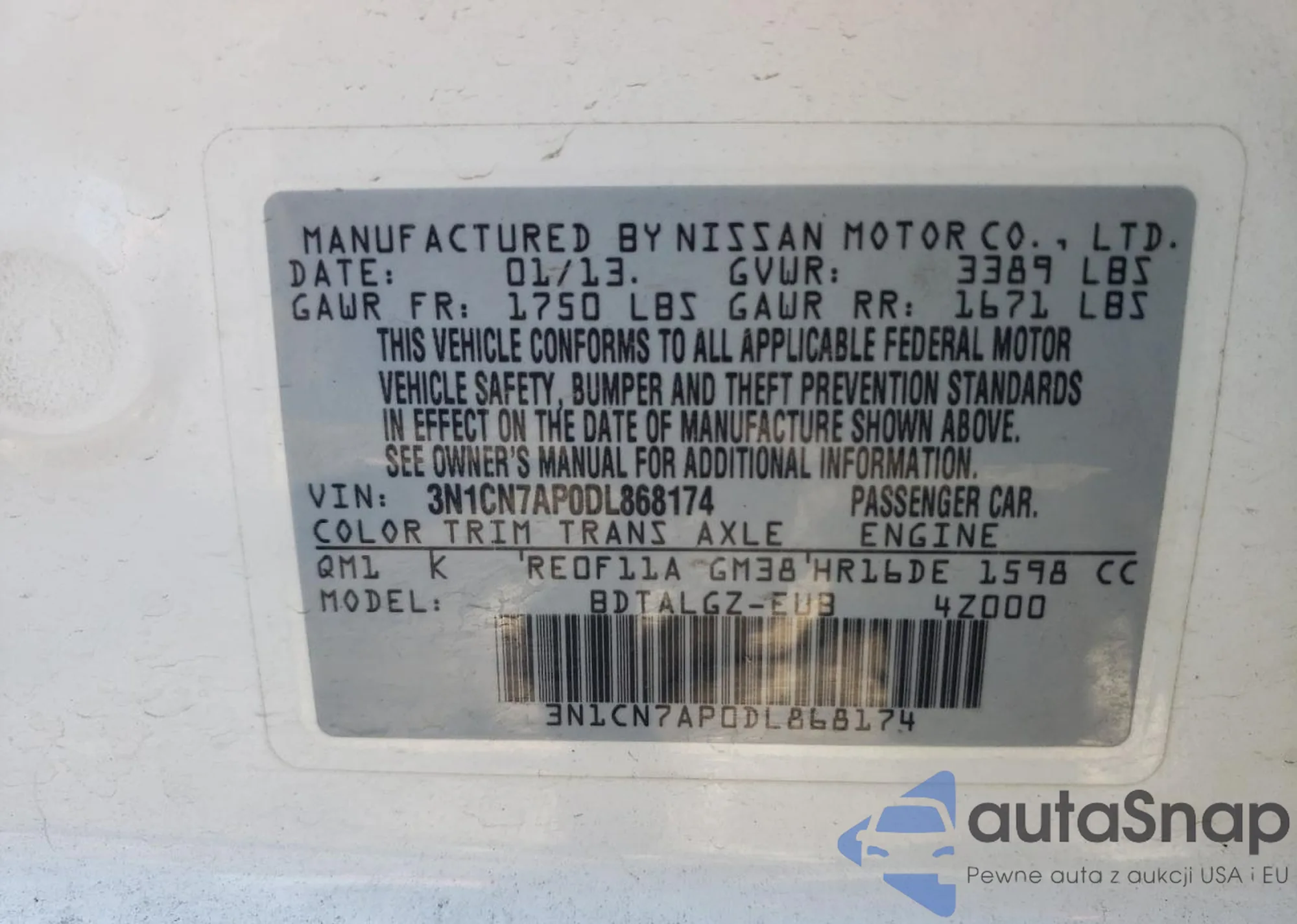 • VIN 3N1CN7AP0DL868174