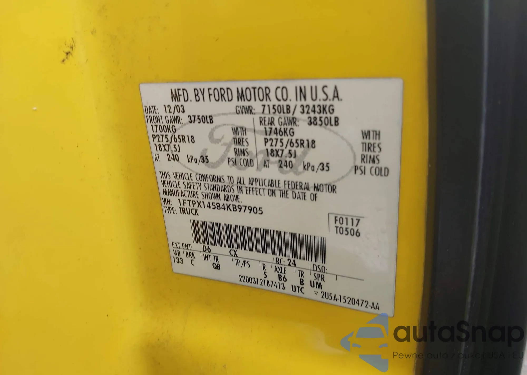 LOT: 42914204 VIN: 1FTPX14584KB97905