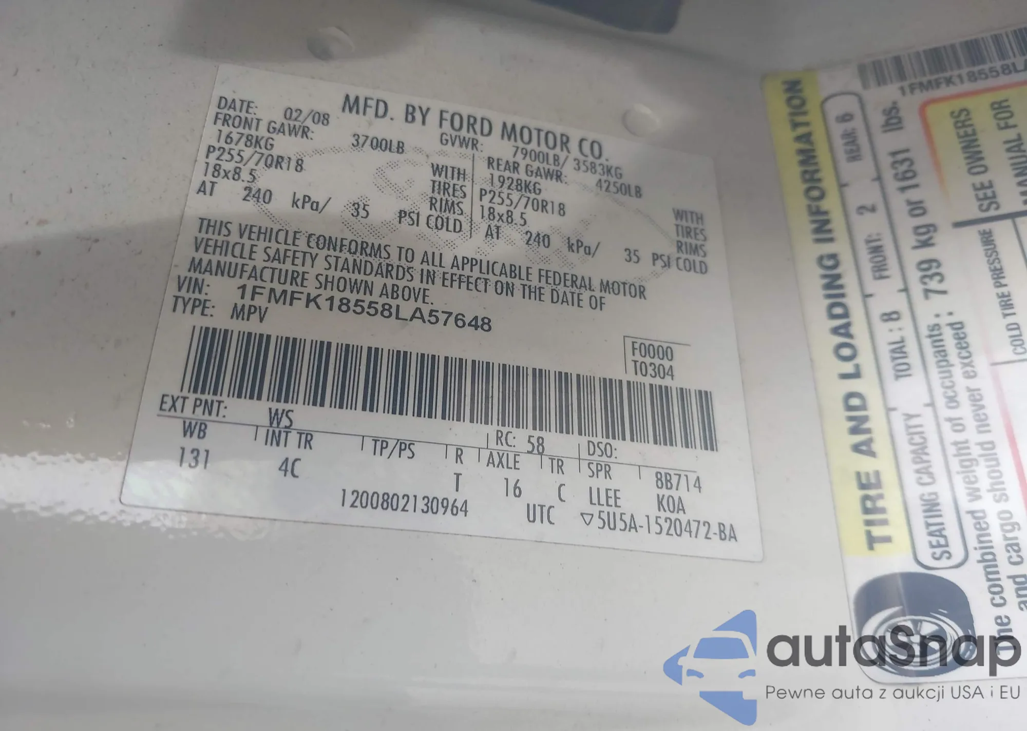 LOT: 42915901 VIN: 1FMFK18558LA57648