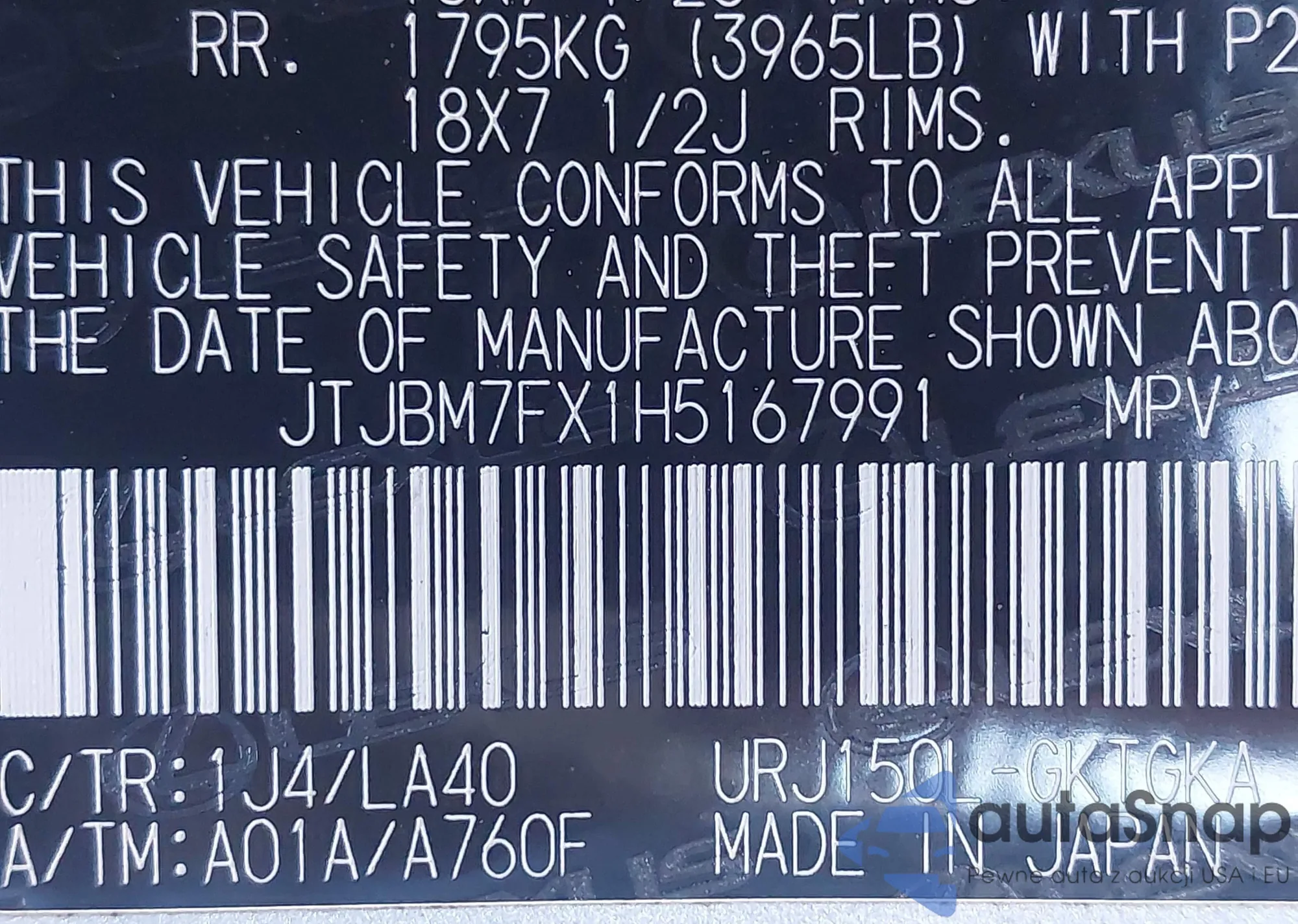 • VIN JTJBM7FX1H5167991