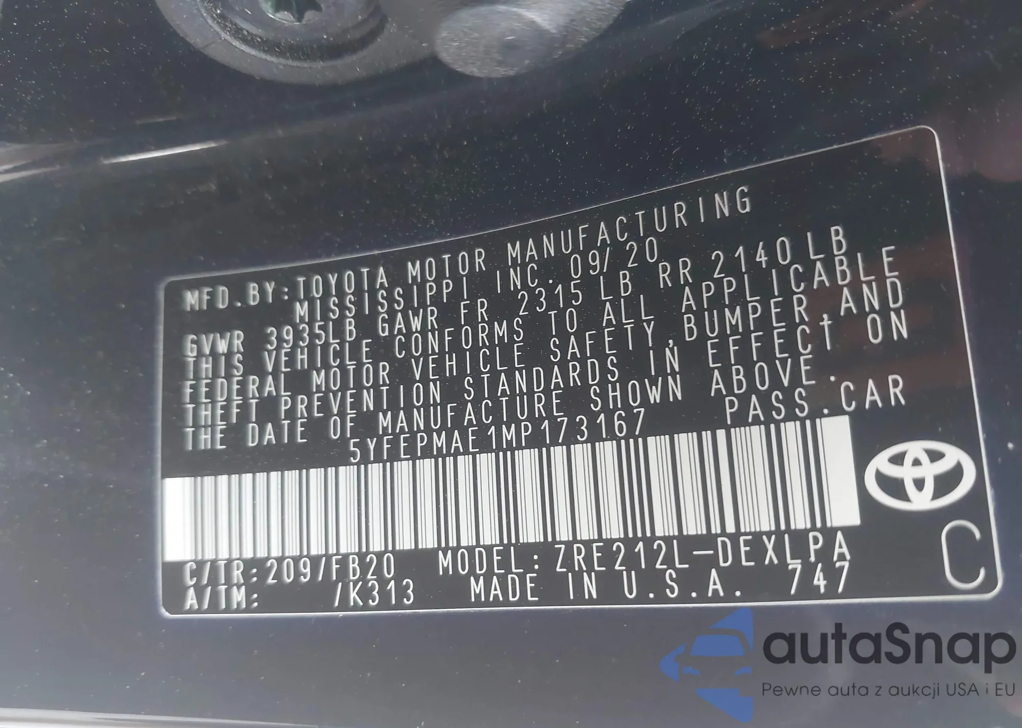 LOT: 42315243 VIN: 5YFEPMAE1MP173167