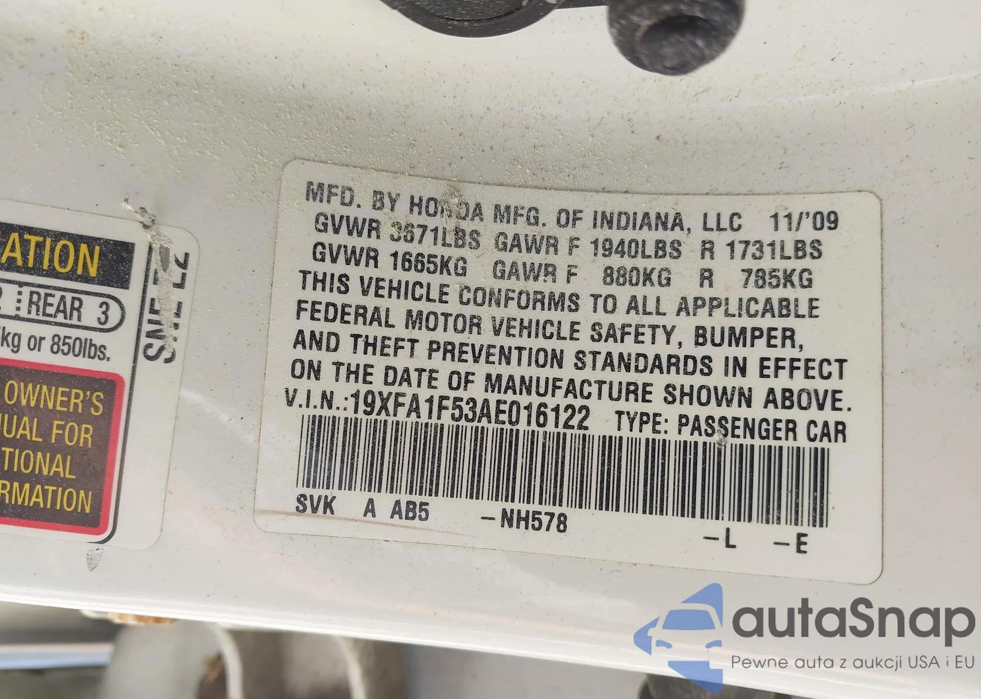 • VIN 19XFA1F53AE016122
