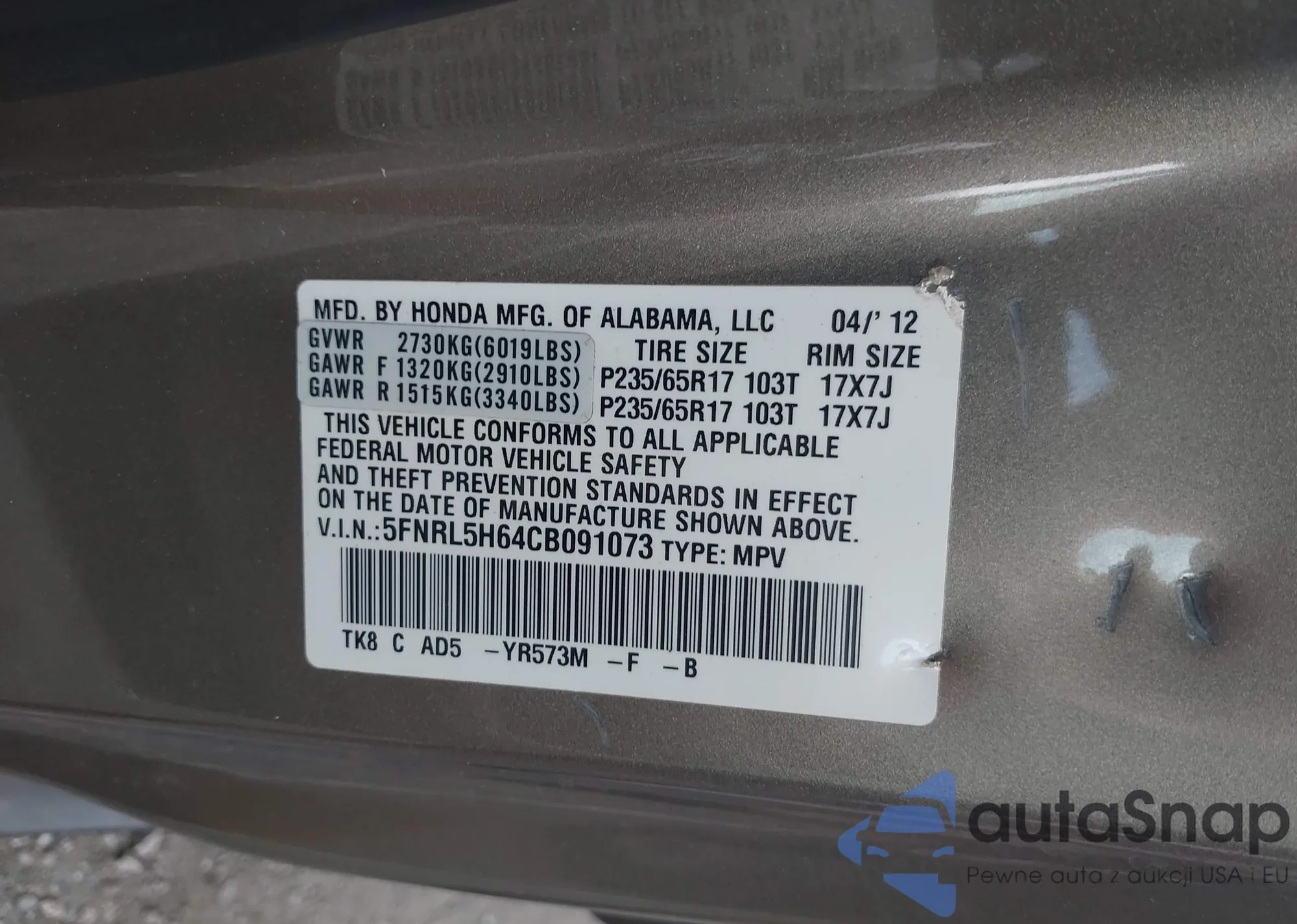 • VIN 5FNRL5H64CB091073
