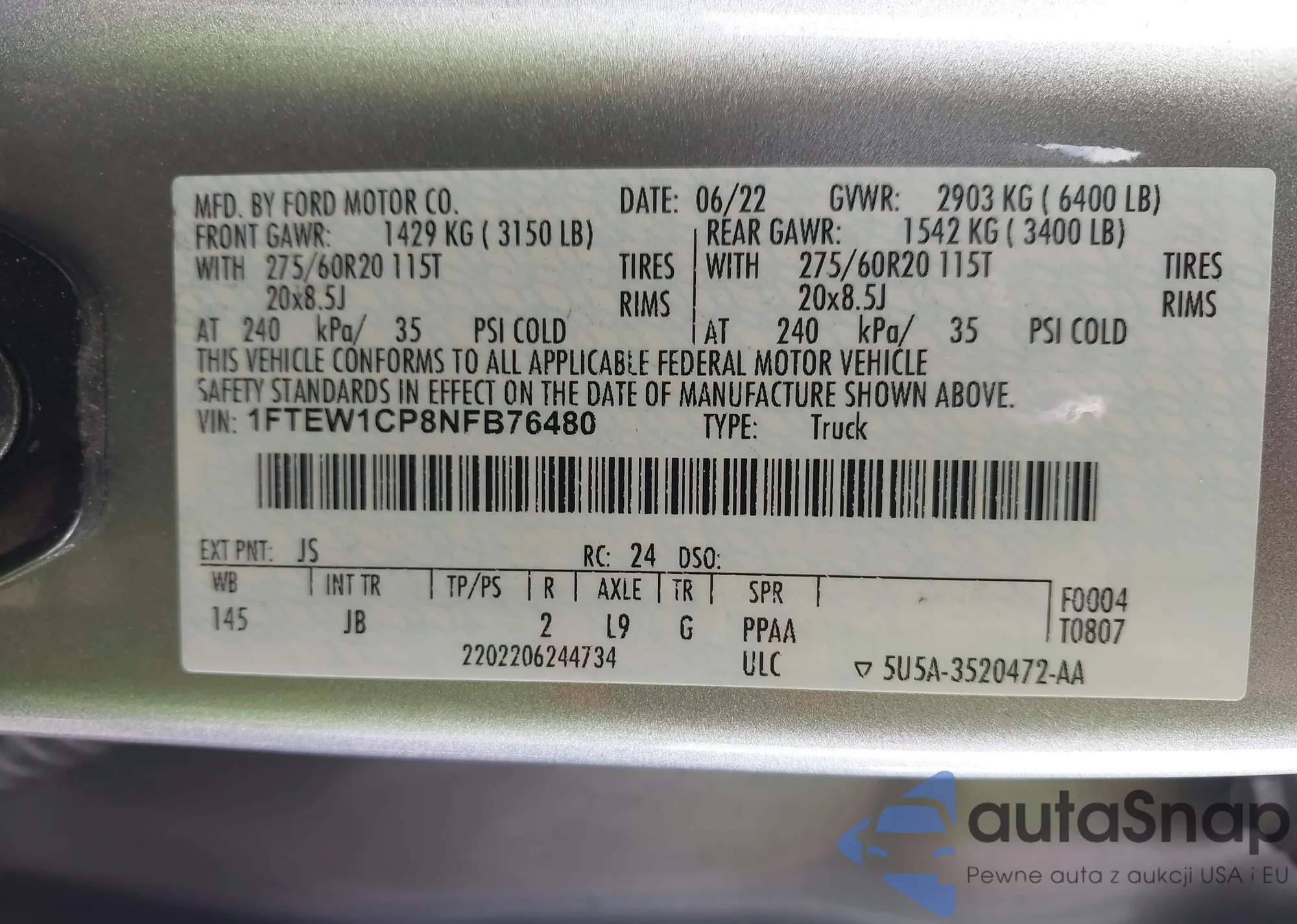 LOT: 42886078 VIN: 1FTEW1CP8NFB76480