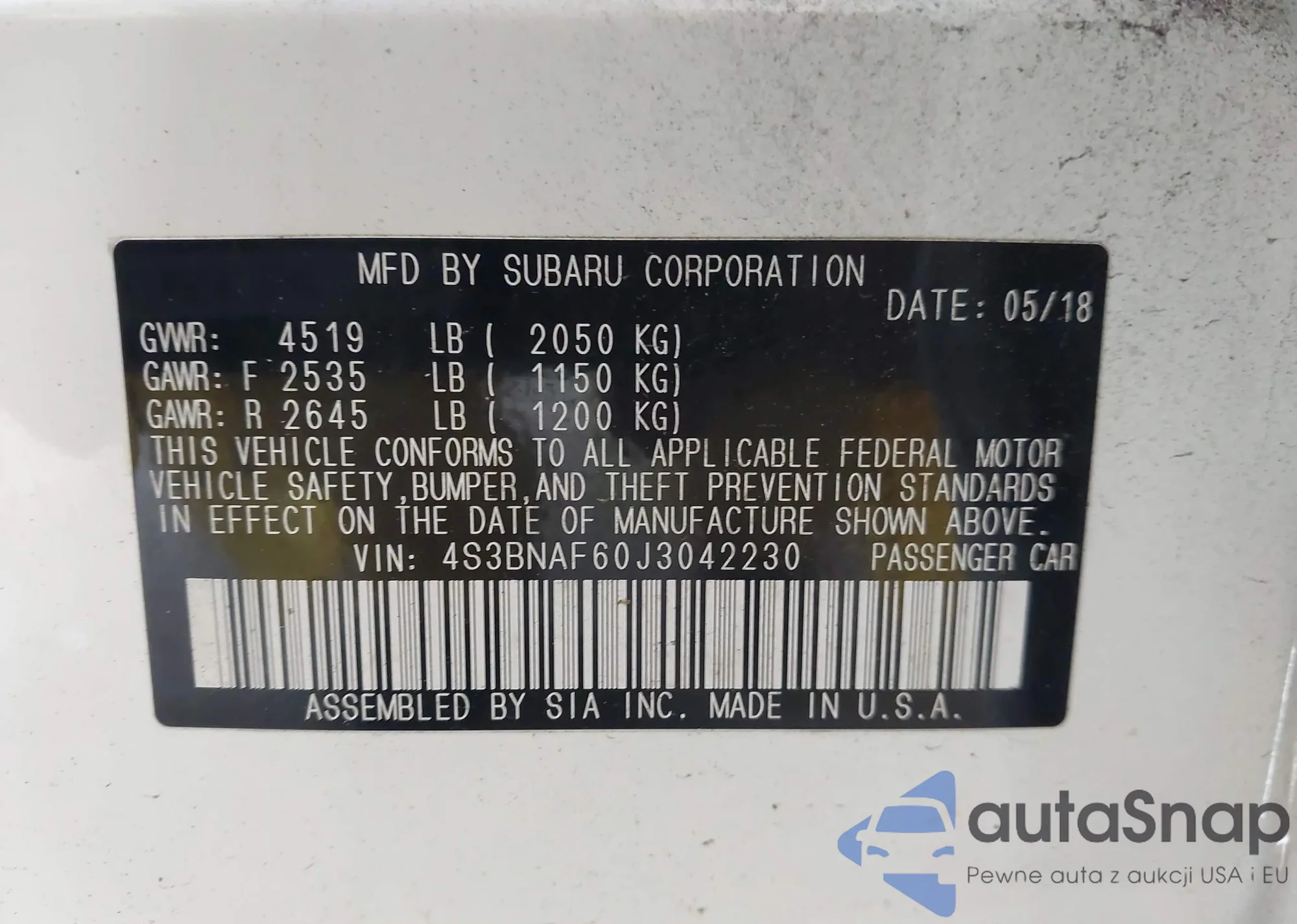 LOT: 42904944 VIN: 4S3BNAF60J3042230