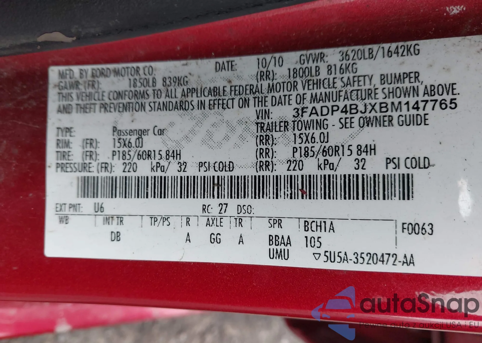 • VIN 3FADP4BJXBM147765