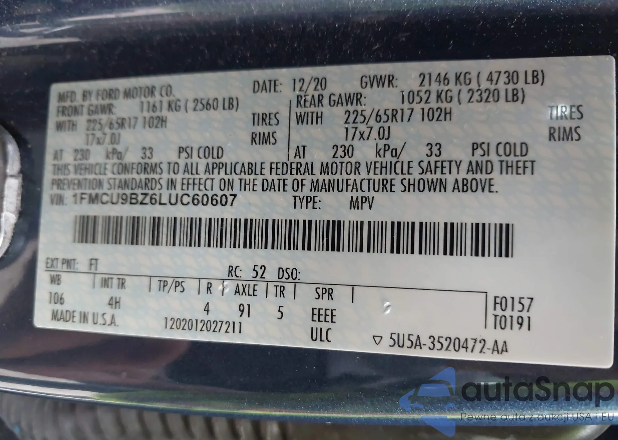 LOT: 42360853 VIN: 1FMCU9BZ6LUC60607