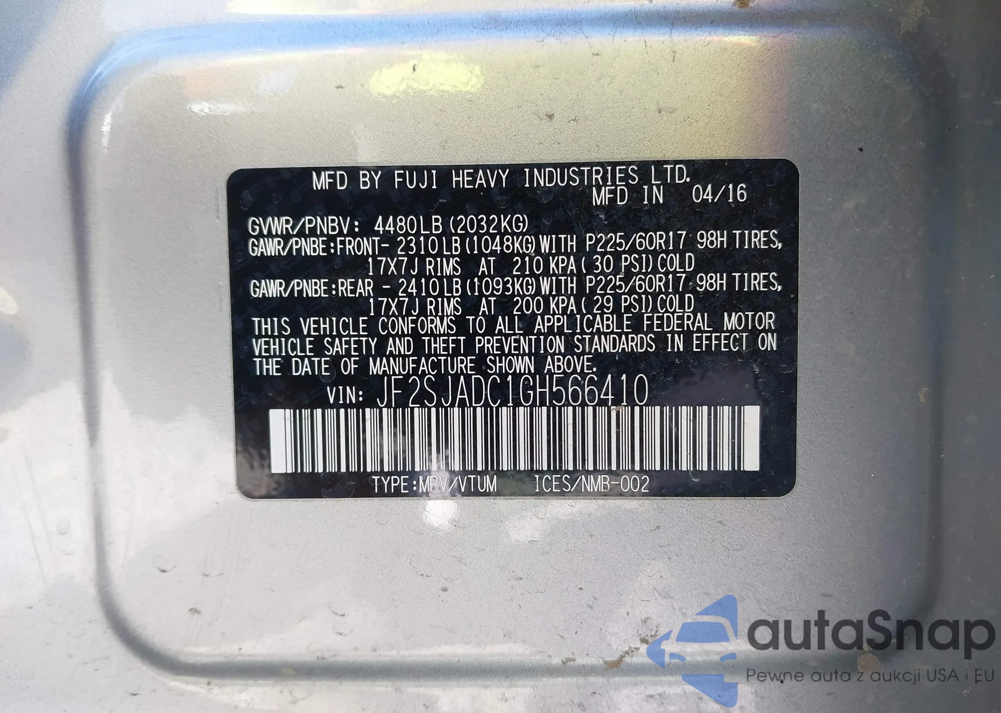 LOT: 42862772 VIN: JF2SJADC1GH566410