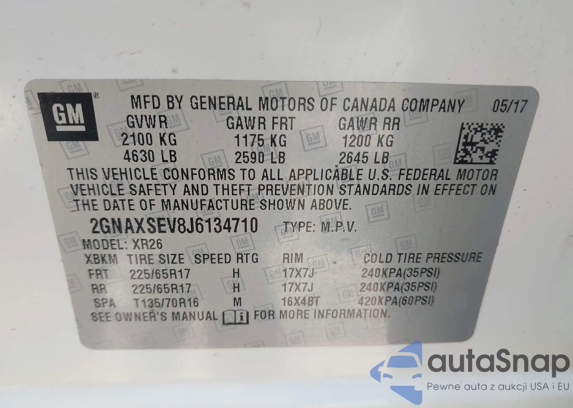 LOT: 42617581 VIN: 2GNAXSEV8J6134710