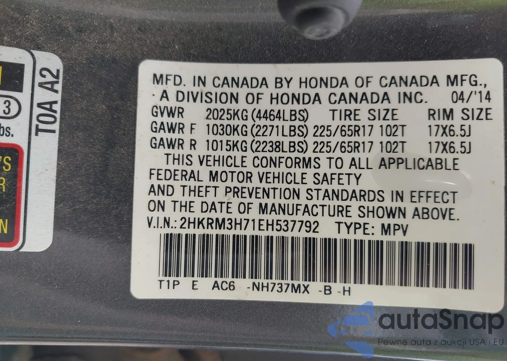 • VIN 2HKRM3H71EH537792