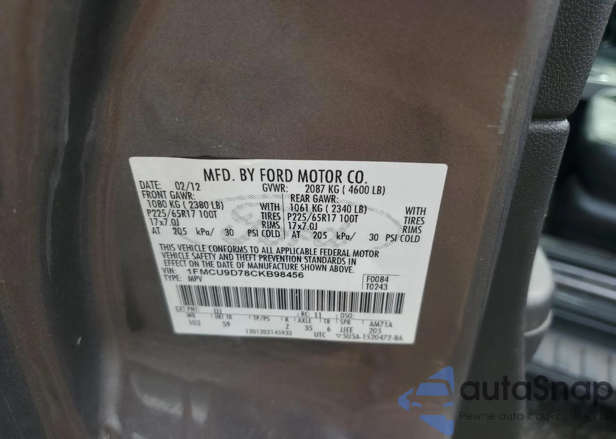 LOT: 65287465 VIN: 1FMCU9D78CKB98456