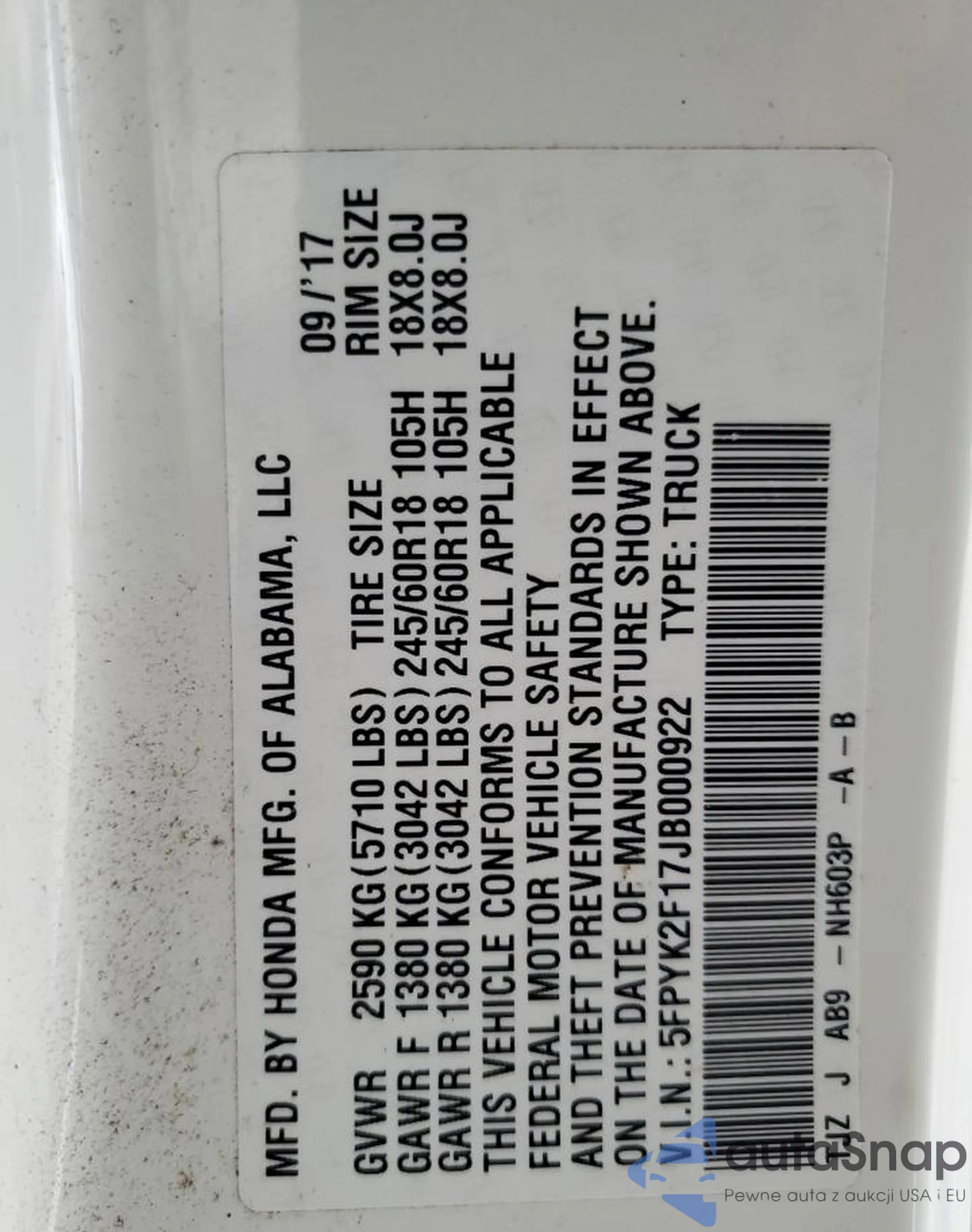 • VIN 5FPYK2F17JB000922