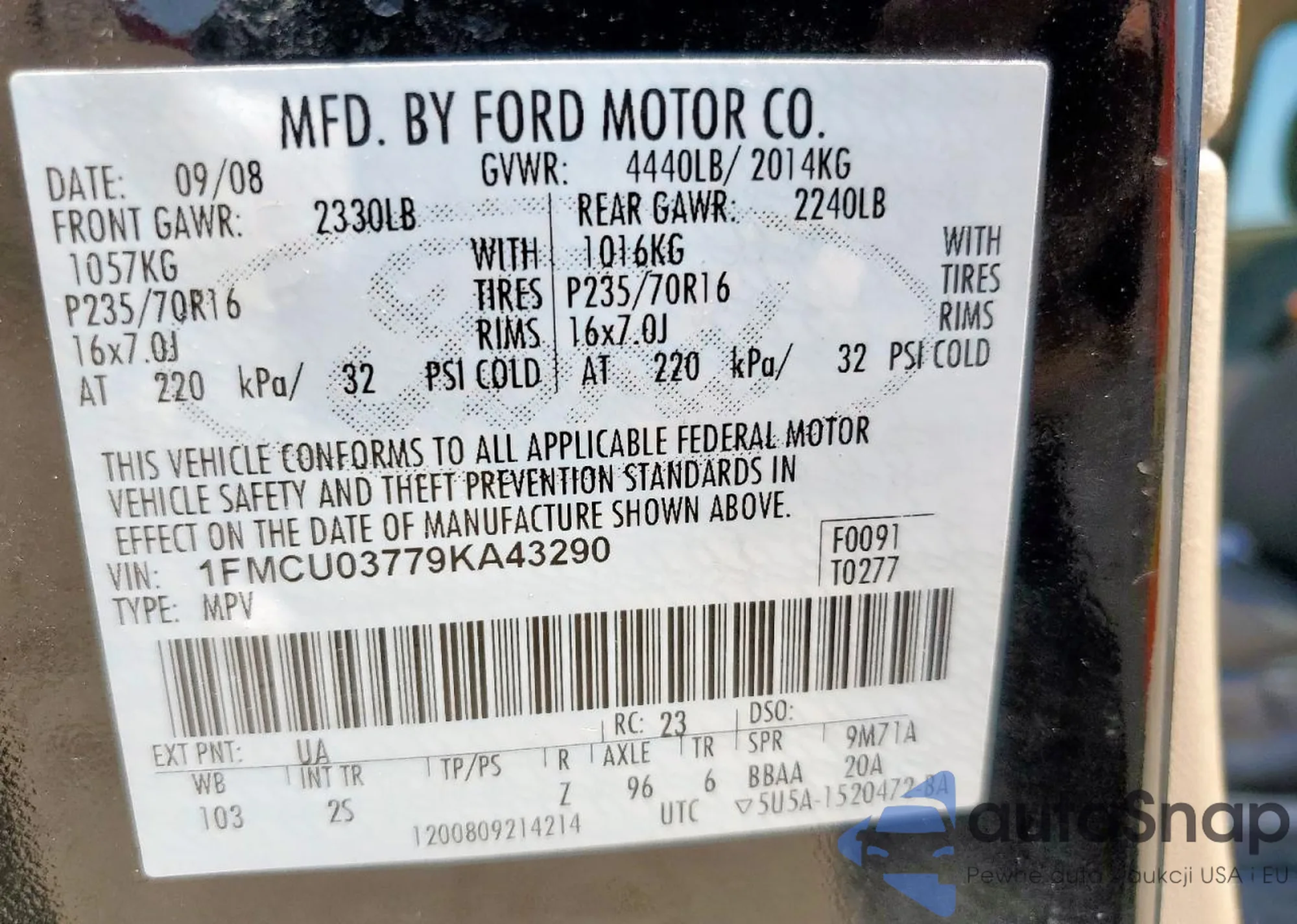 • VIN 1FMCU03779KA43290