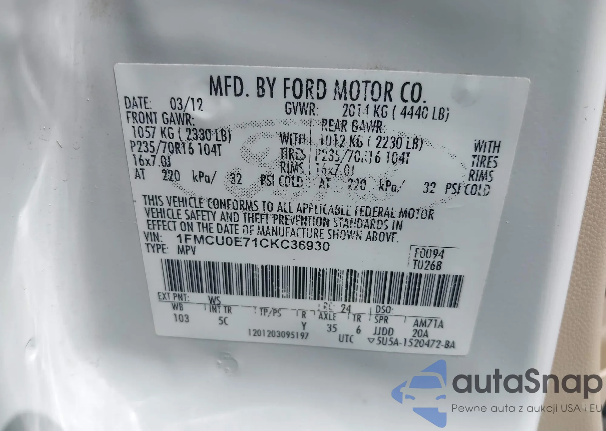 LOT: 42936698 VIN: 1FMCU0E71CKC36930