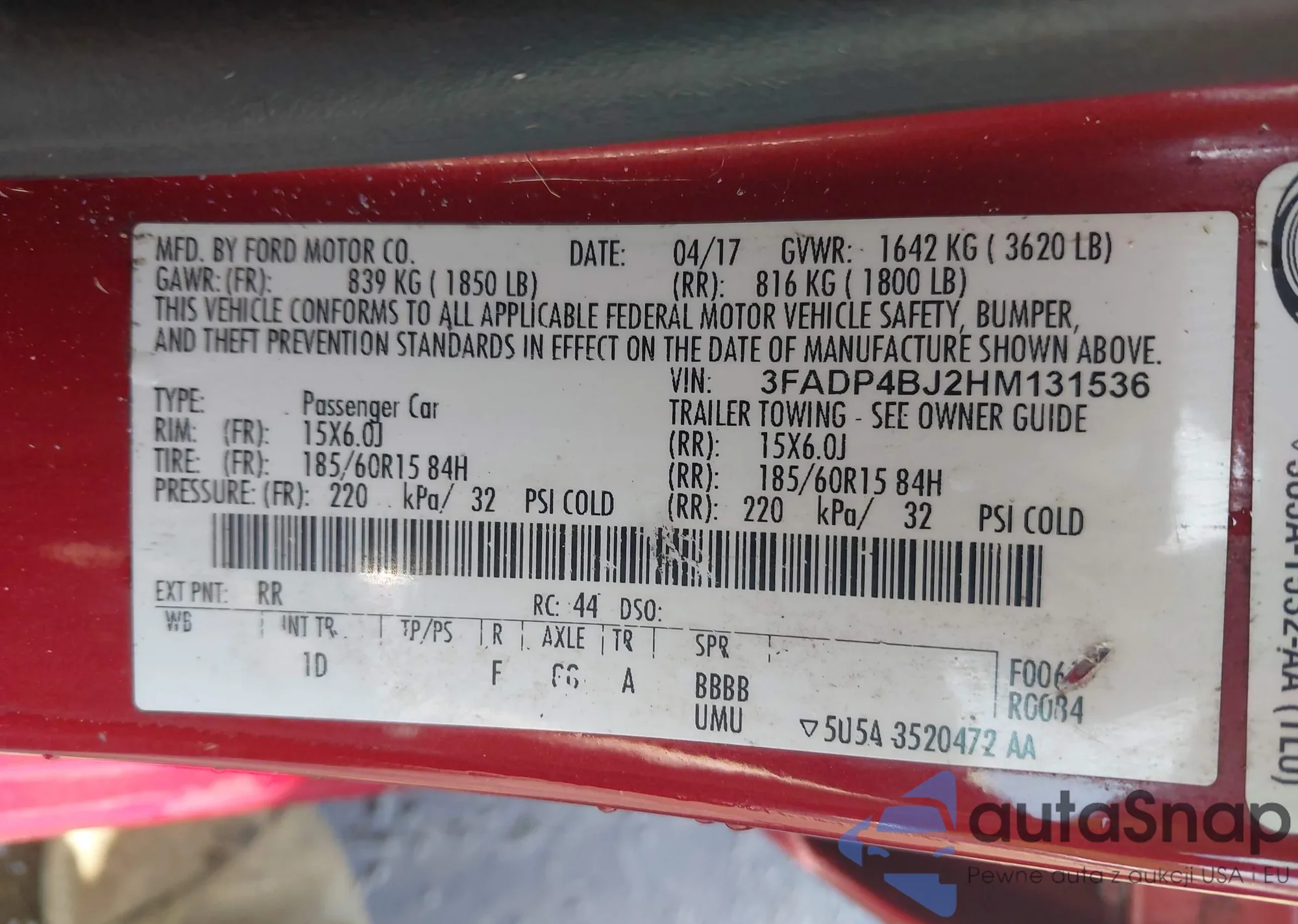 LOT: 42564234 VIN: 3FADP4BJ2HM131536