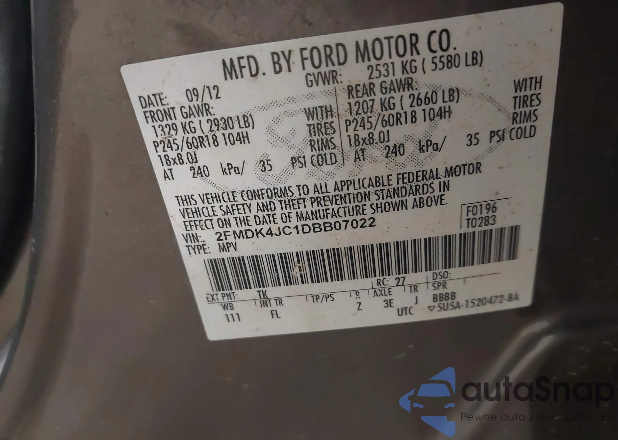 LOT: 42755657 VIN: 2FMDK4JC1DBB07022