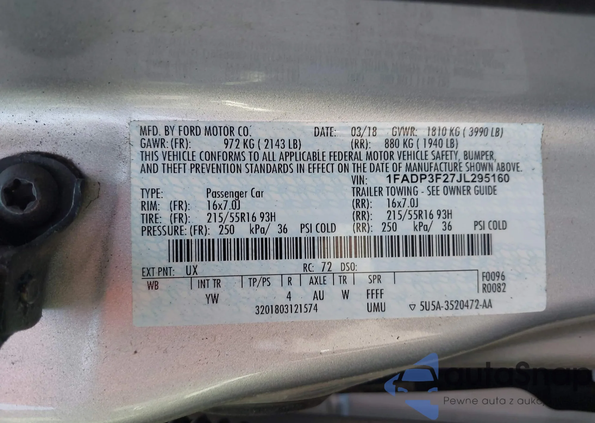 • VIN 1FADP3F27JL295160