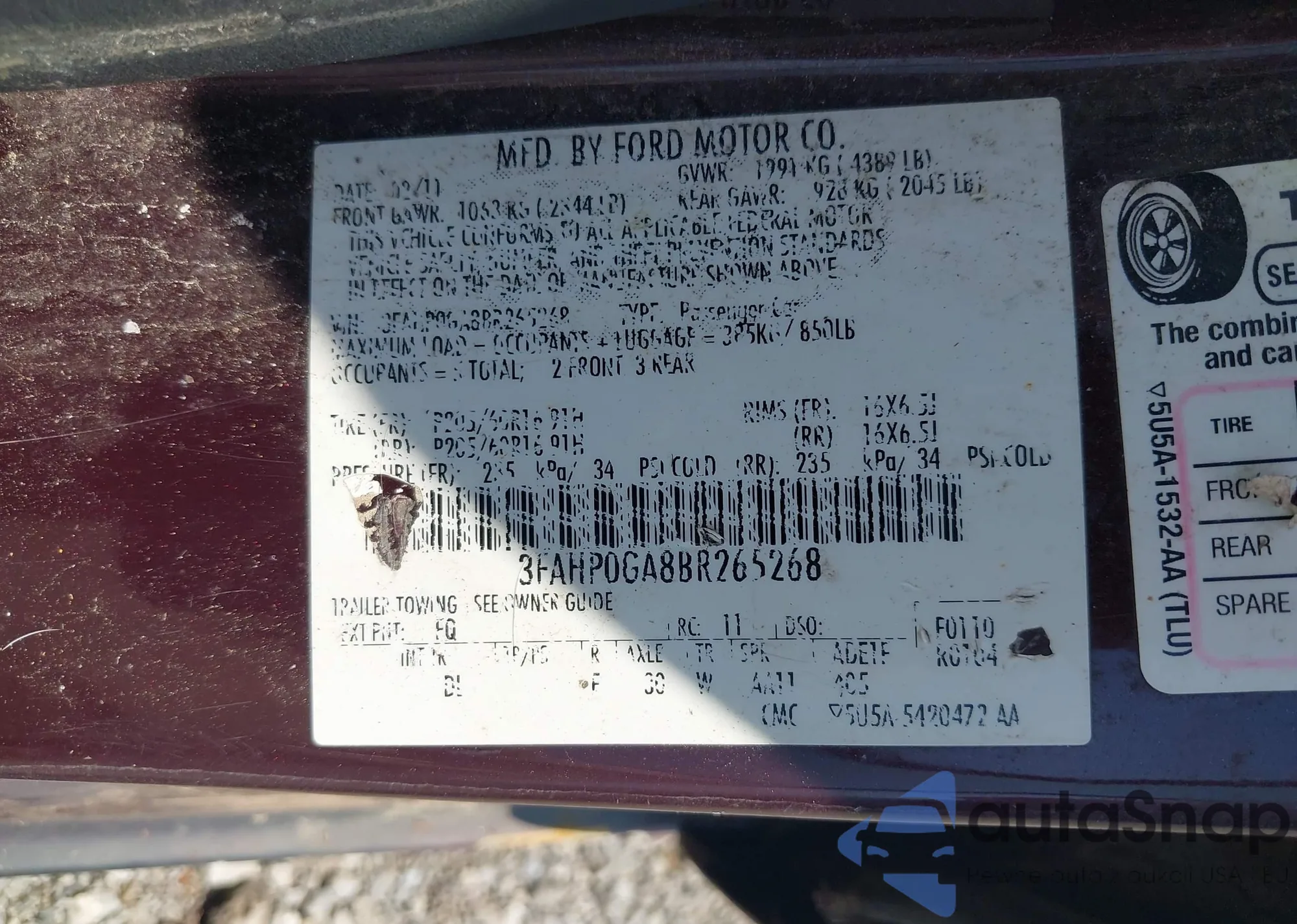 LOT: 42835111 VIN: 3FAHP0GA8BR265268