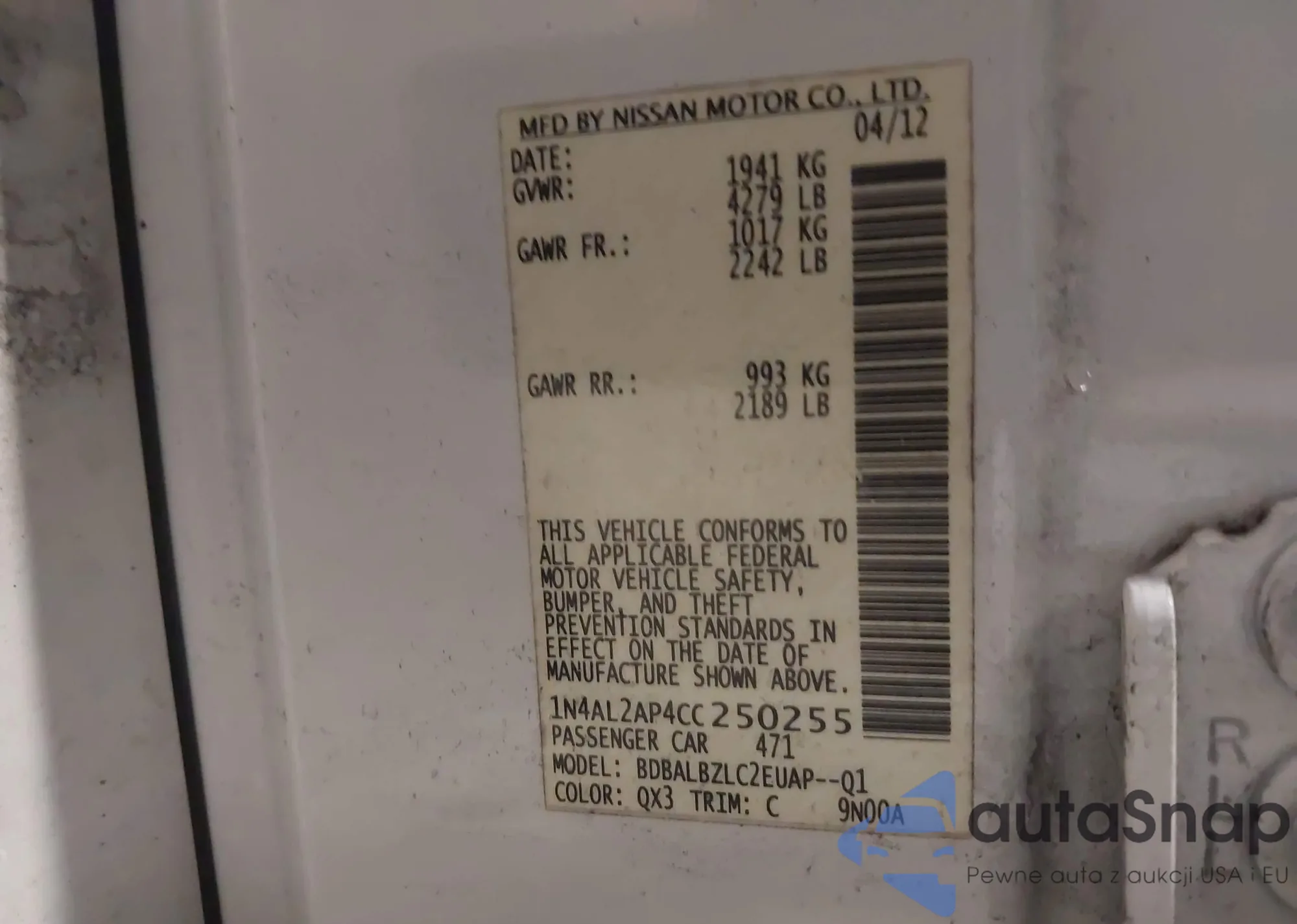 LOT: 42638423 VIN: 1N4AL2AP4CC250255