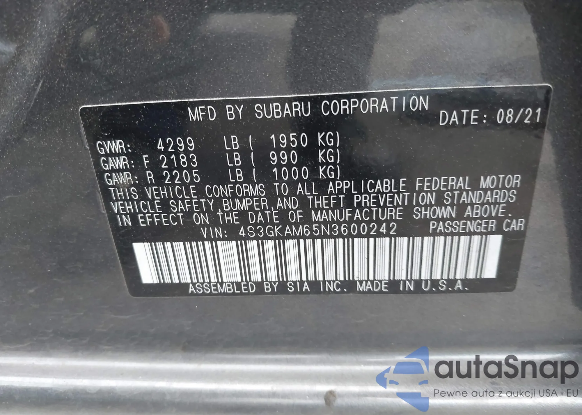 • VIN 4S3GKAM65N3600242