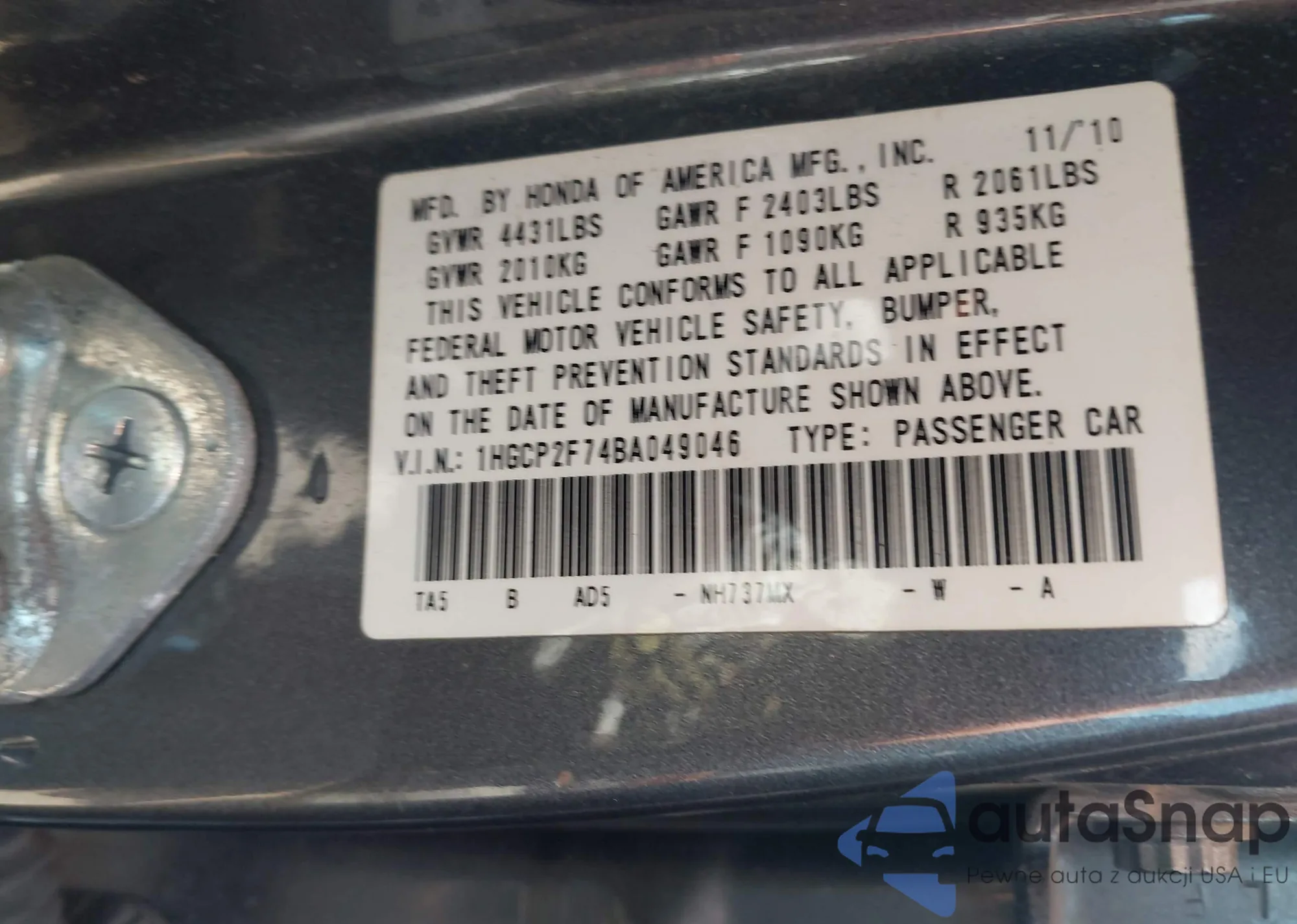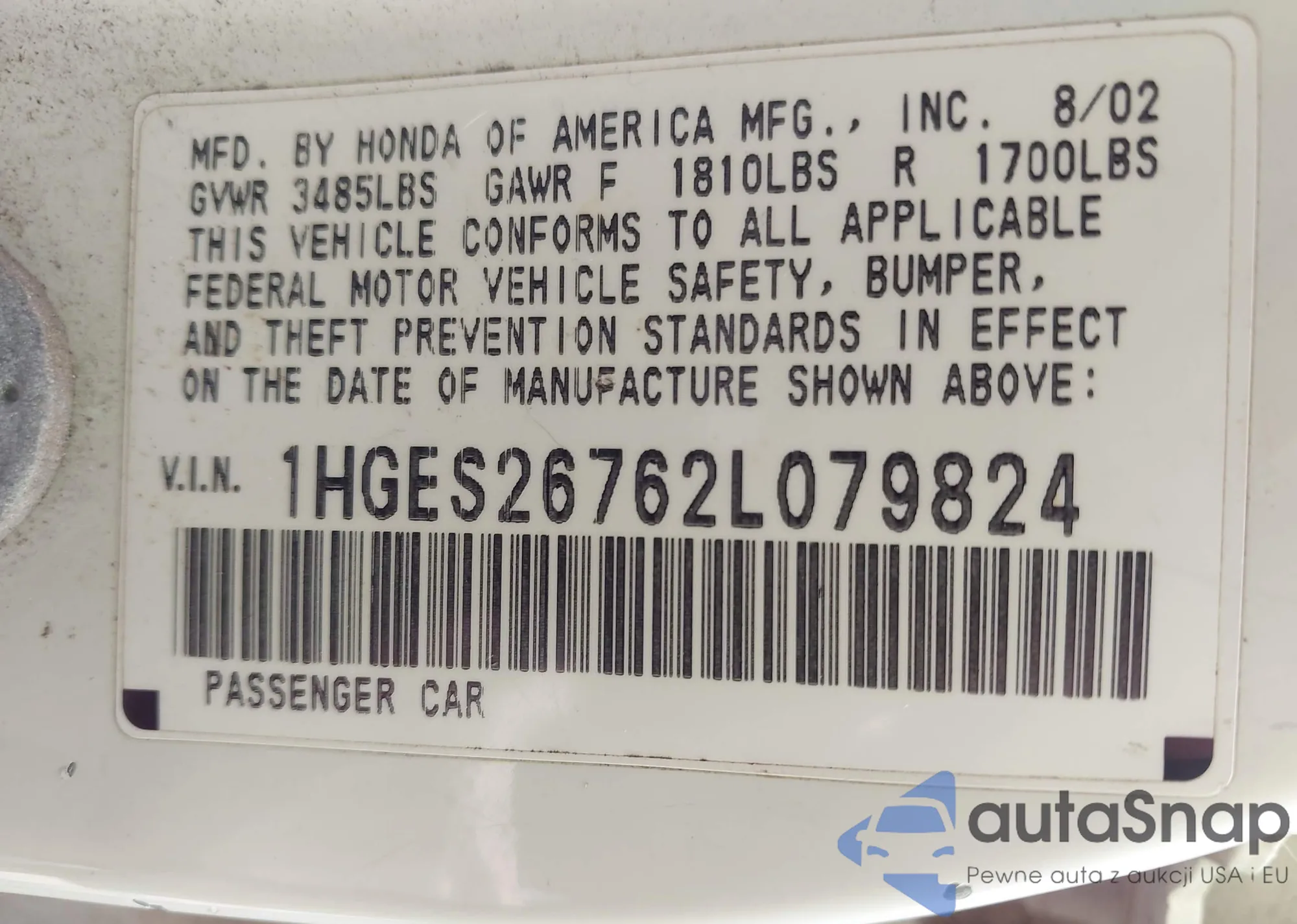 LOT: 42802592 VIN: 1HGES26762L079824