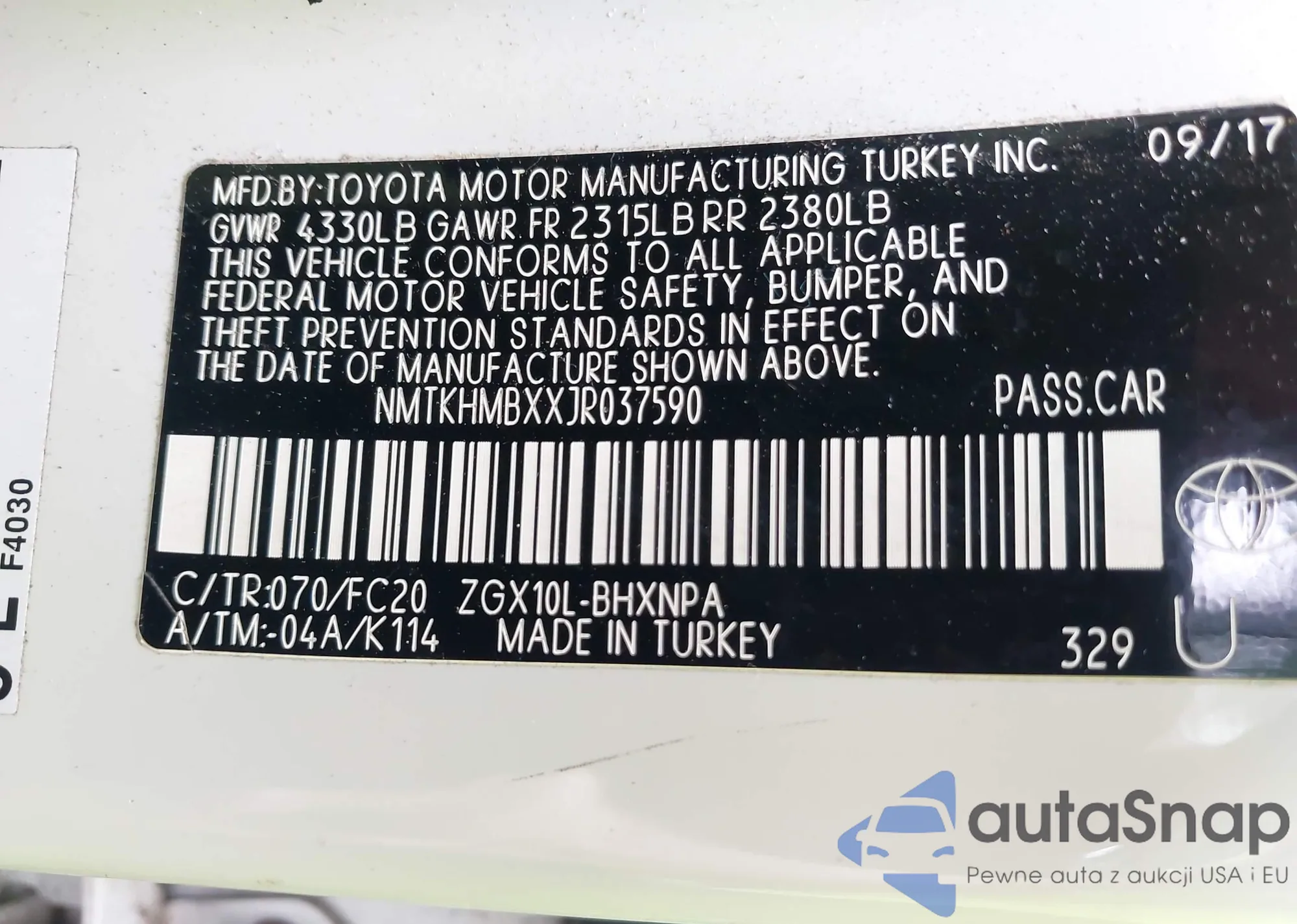 LOT: 42872939 VIN: NMTKHMBXXJR037590