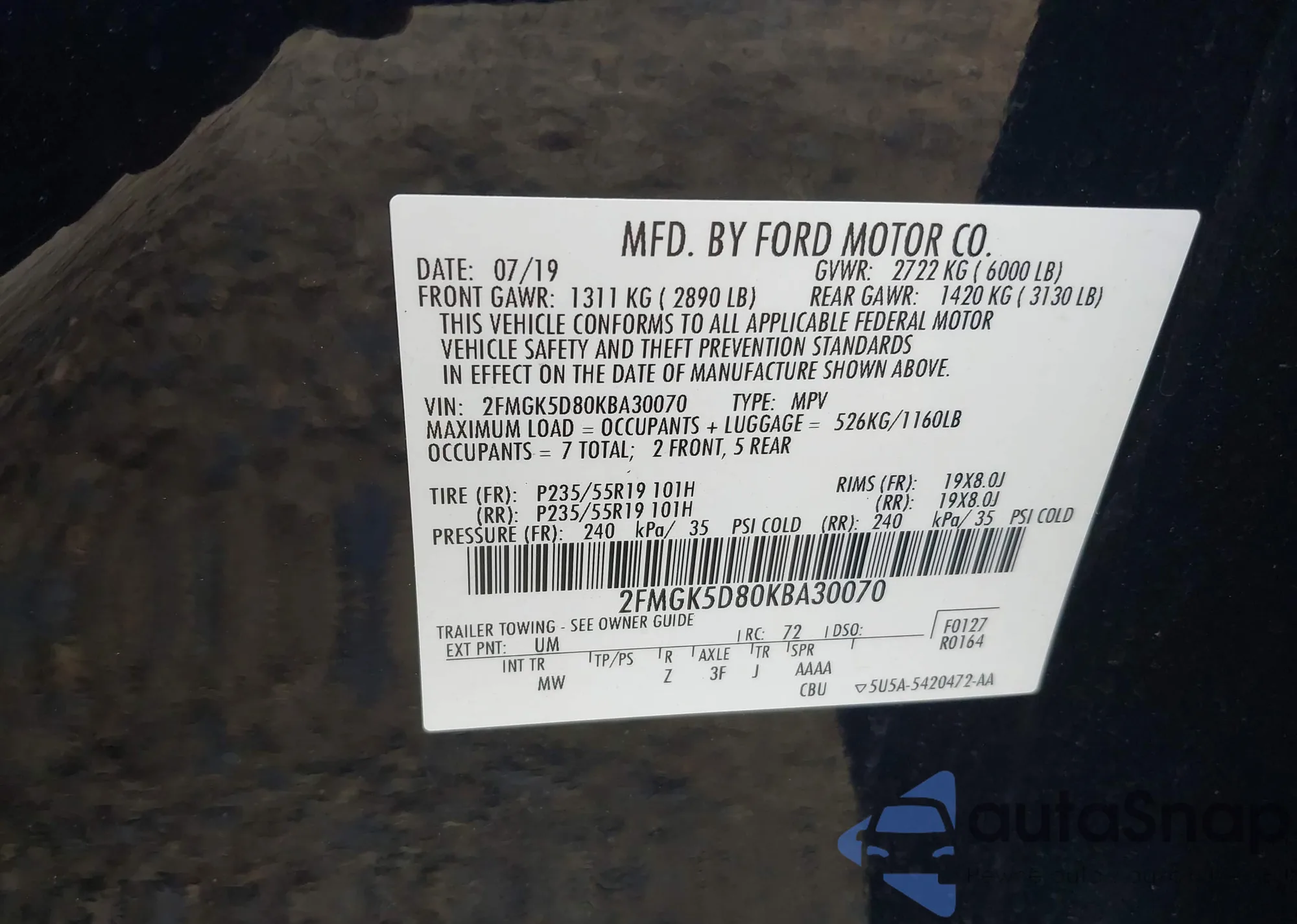• VIN 2FMGK5D80KBA30070