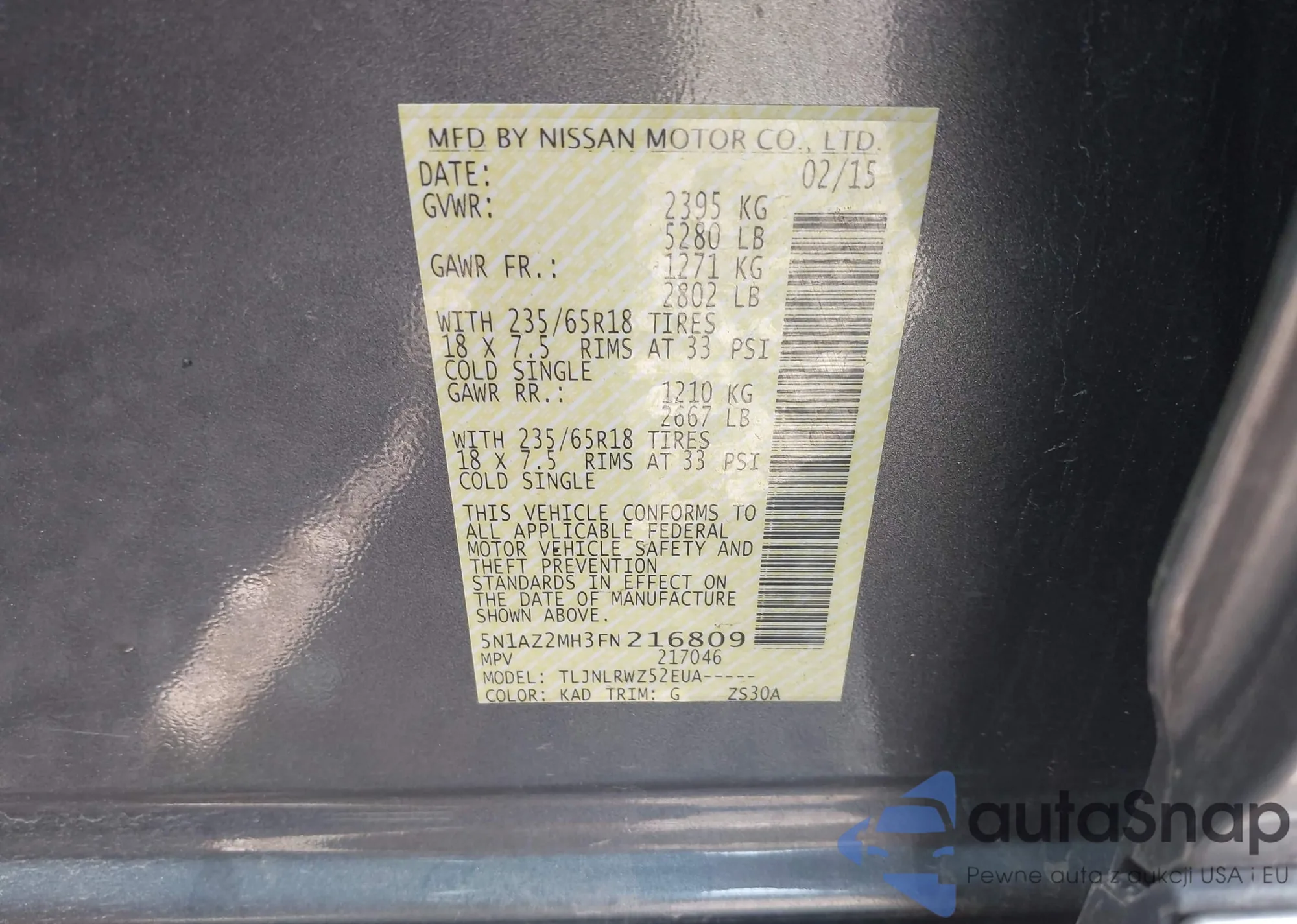 LOT: 42225429 VIN: 5N1AZ2MH3FN216809