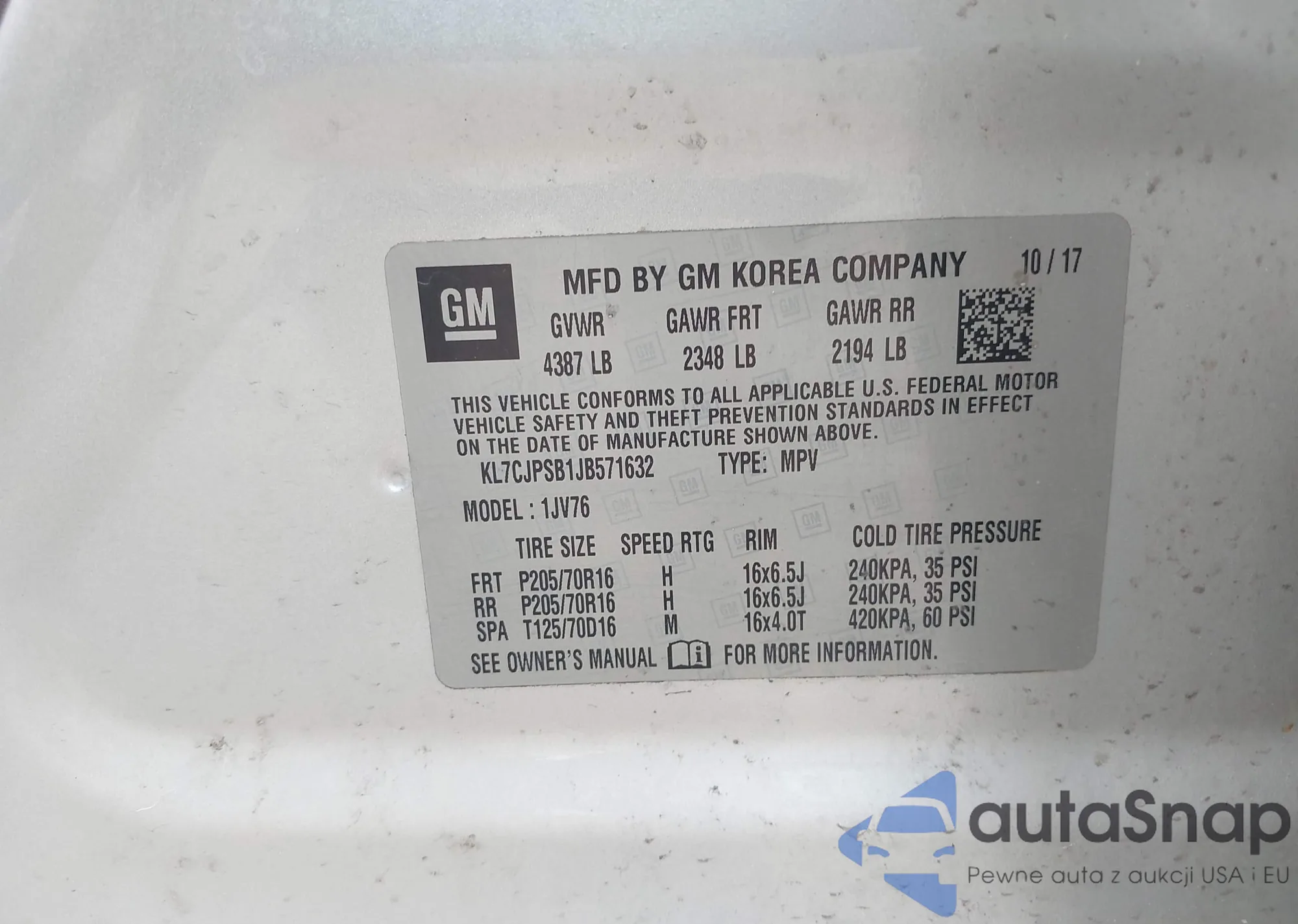 • VIN KL7CJPSB1JB571632