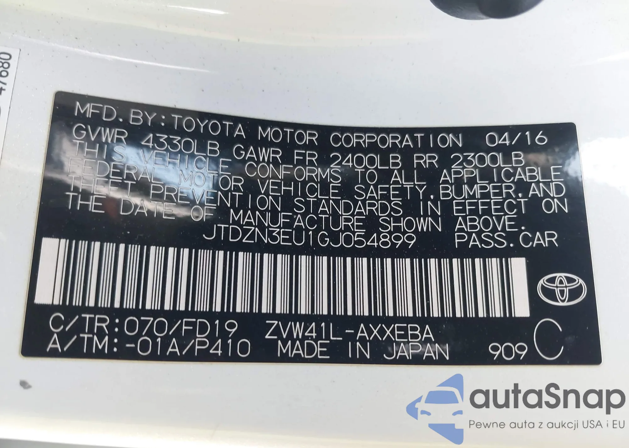 LOT: 42918282 VIN: JTDZN3EU1GJ054899